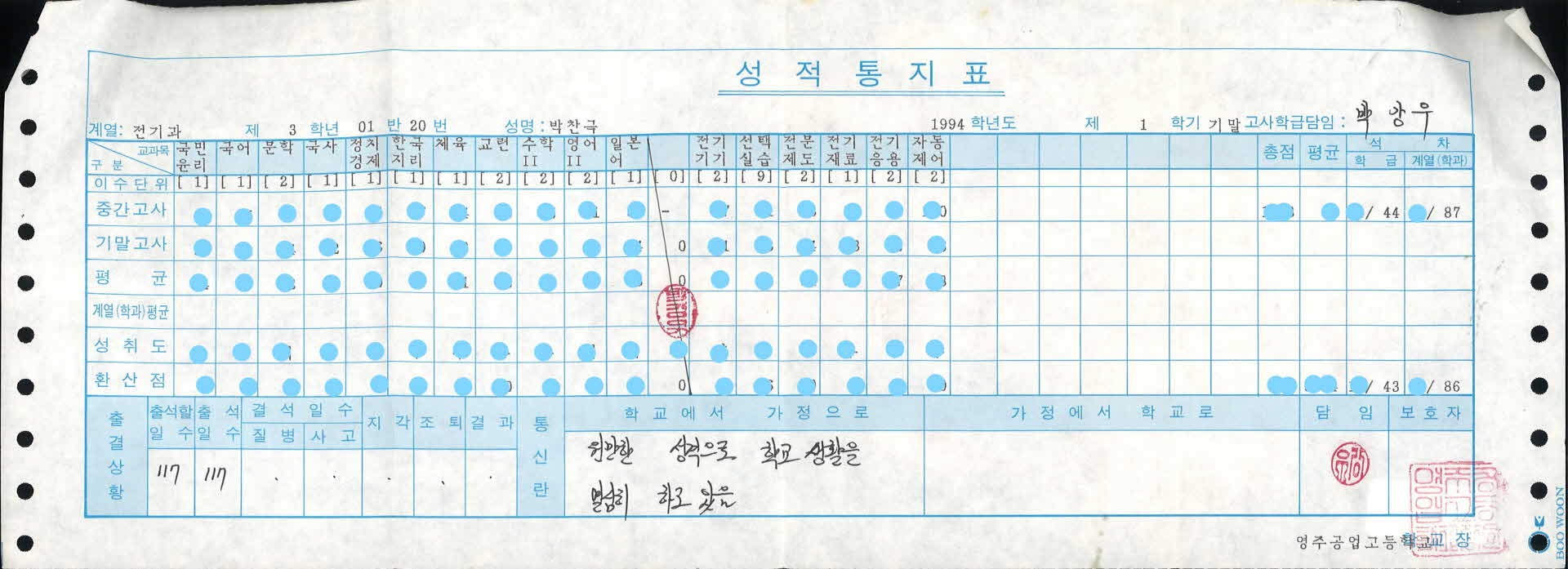| 기록물명 | 1994년 영주공업고등학교 기말고사 성적표 | ||