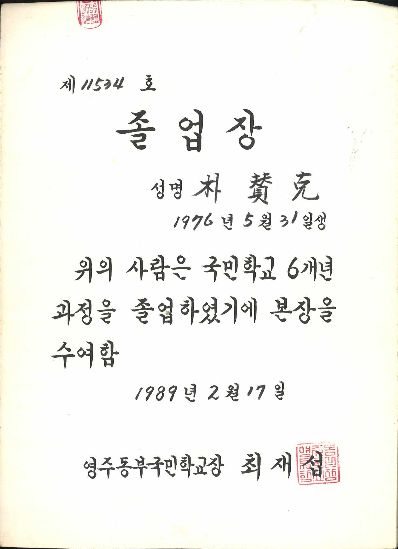 | 기록물명 | 1989년 영주동부국민학교 졸업장 | ||