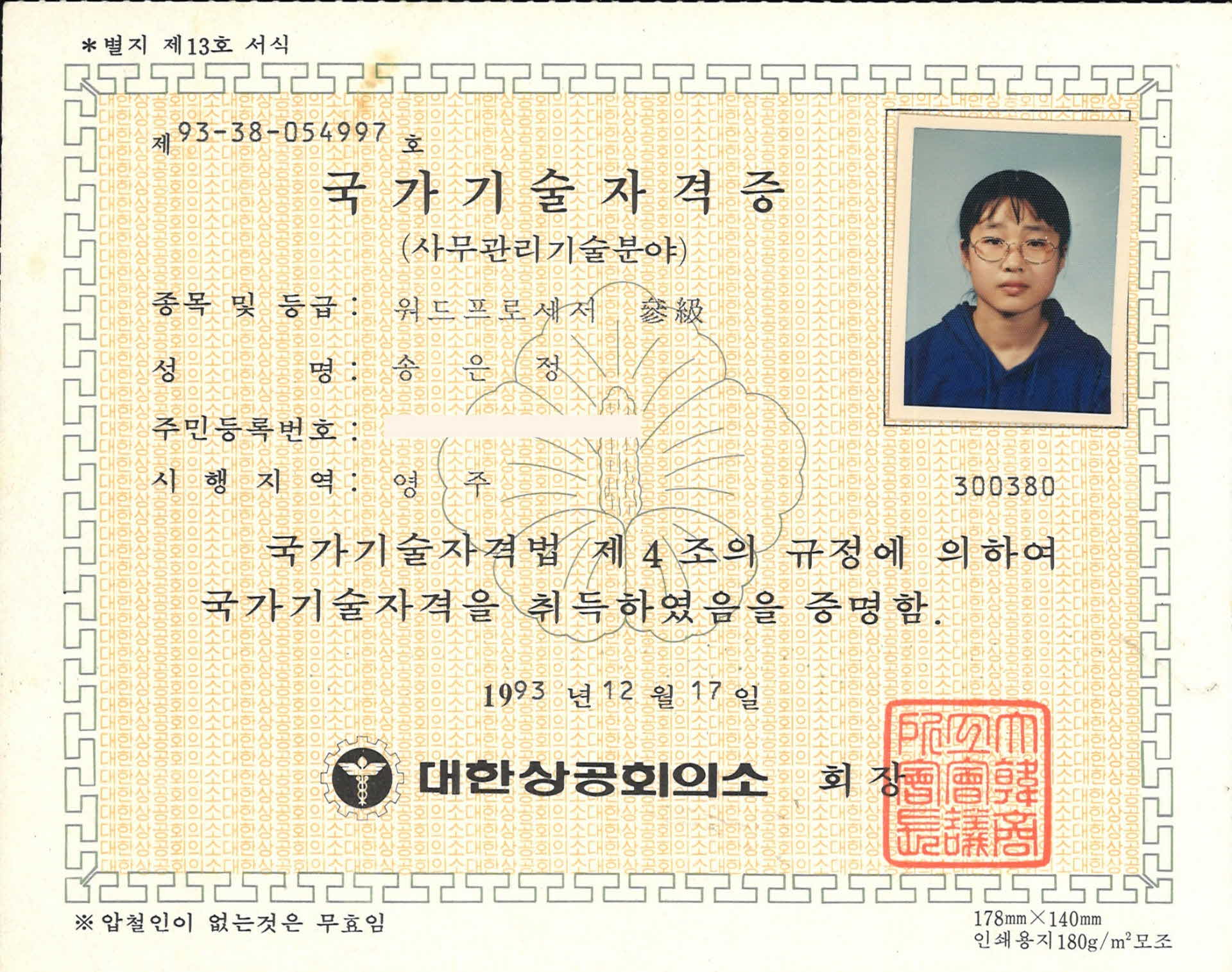 | 기록물명 | 워드프로세서 3급 국가기술자격증 | ||