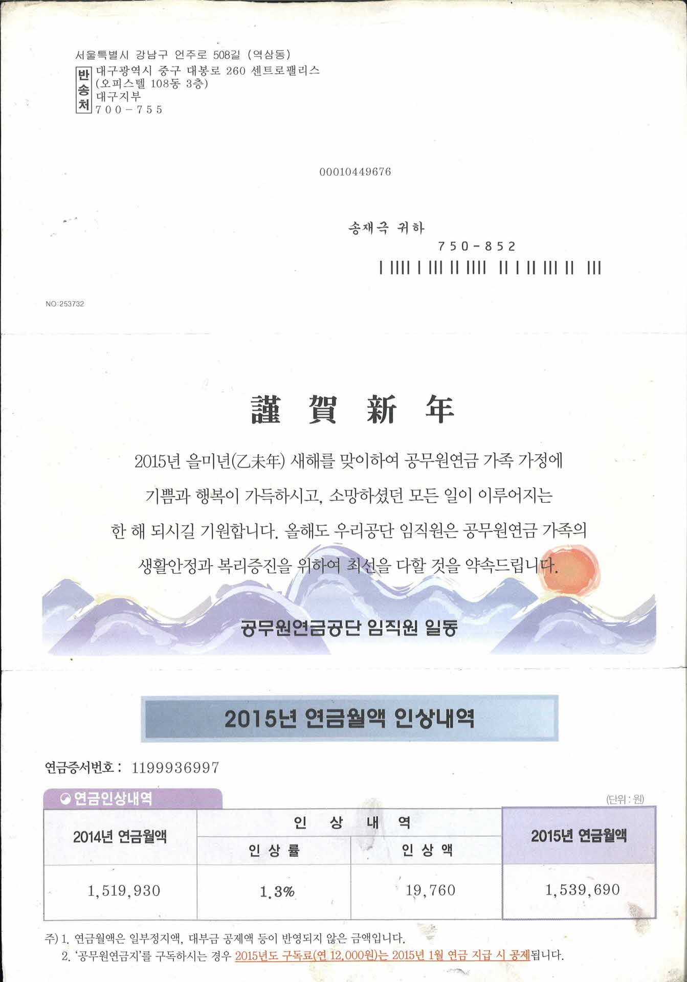| 기록물명 | 공무원 연금공단 연금인상 안내 우편물 | ||