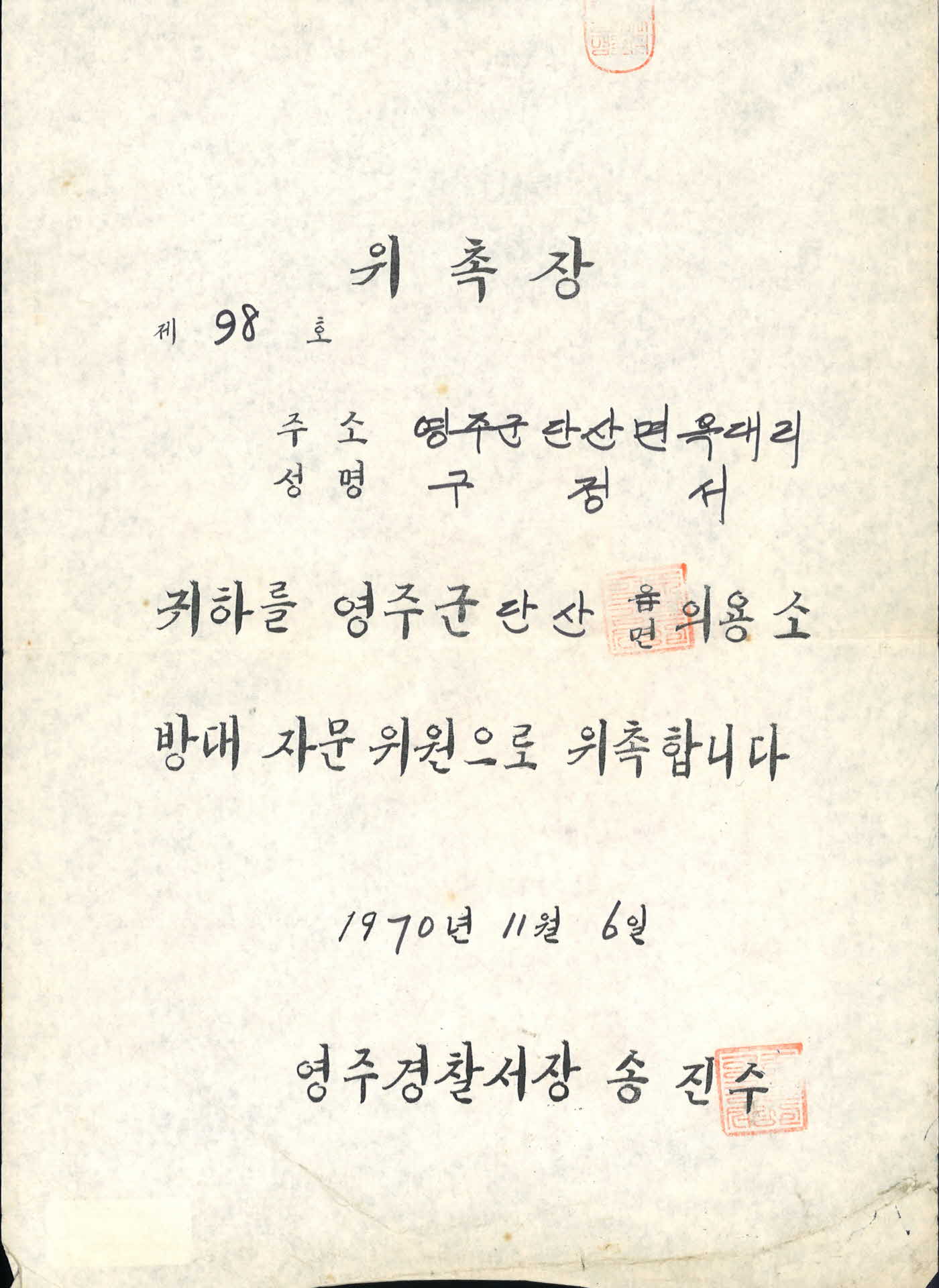 | 기록물명 | 영주경찰서장 단산의용소 방대 자문위원 위촉장 | ||
