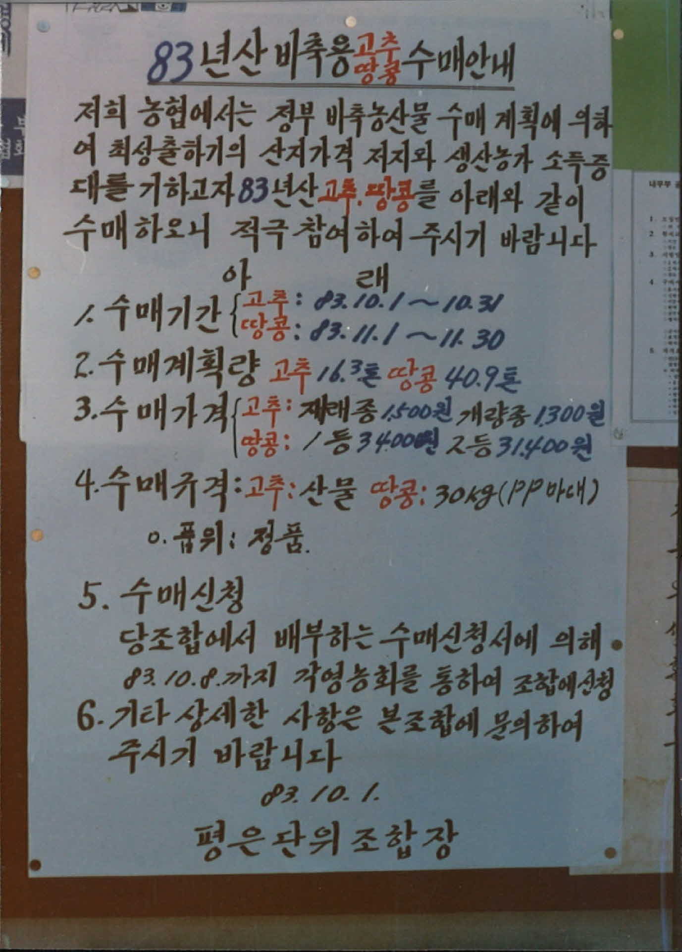 83년산 비축용 고추 땅콩 수매 안내 사진