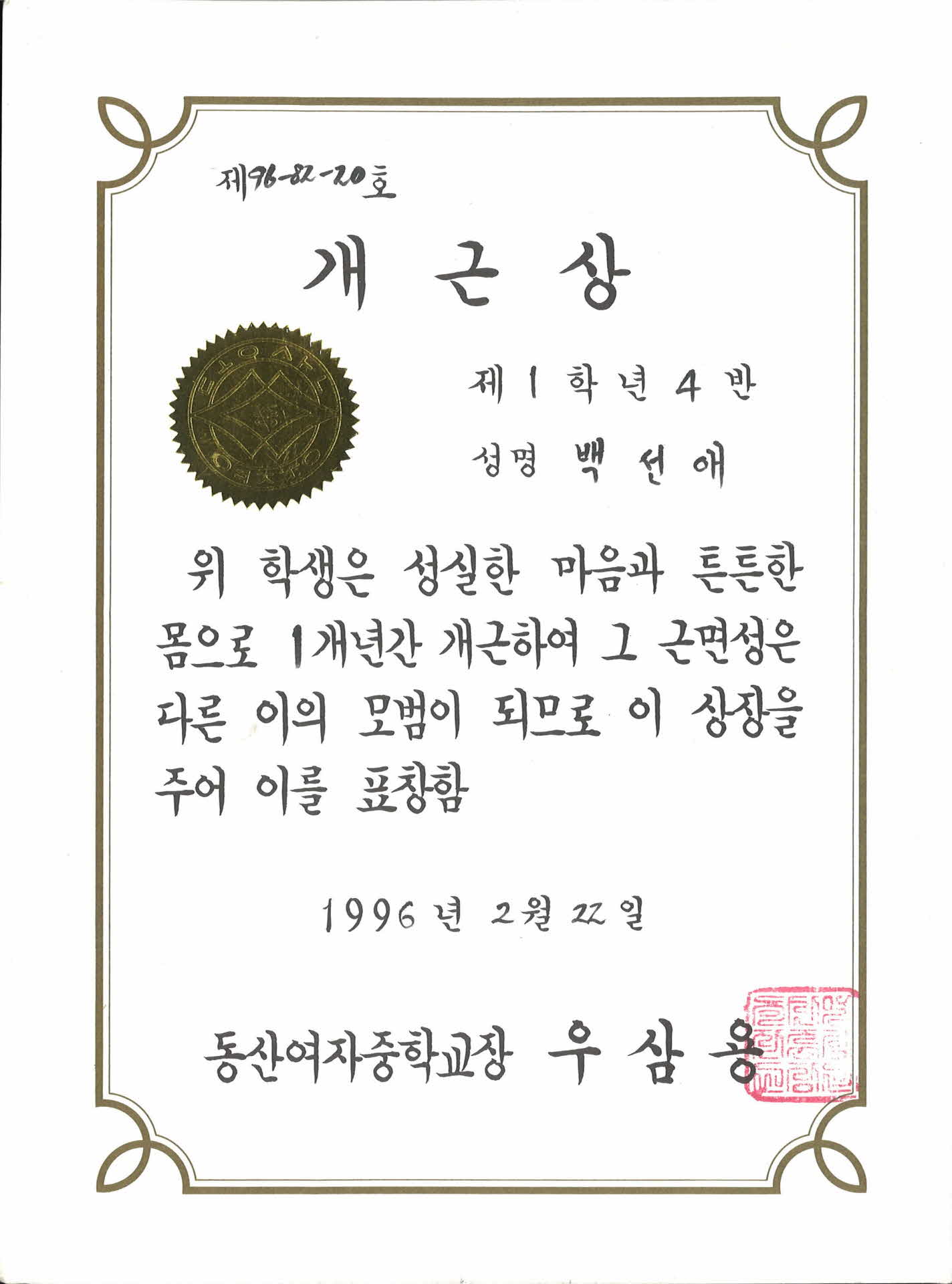 동산여중 개근 상장