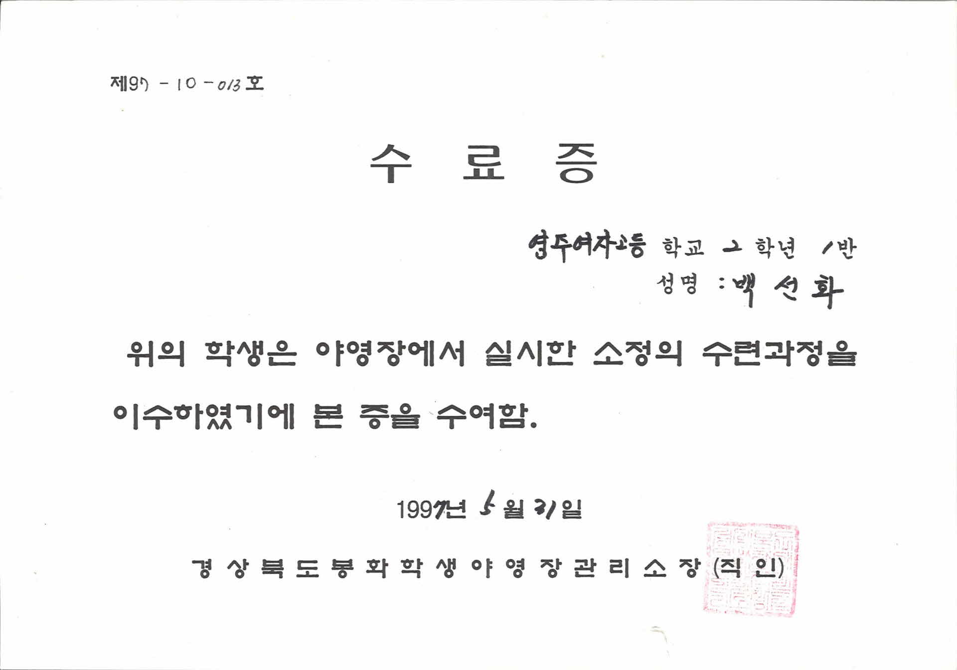 | 기록물명 | 봉화학생야영장 수련과정 수료증 | ||