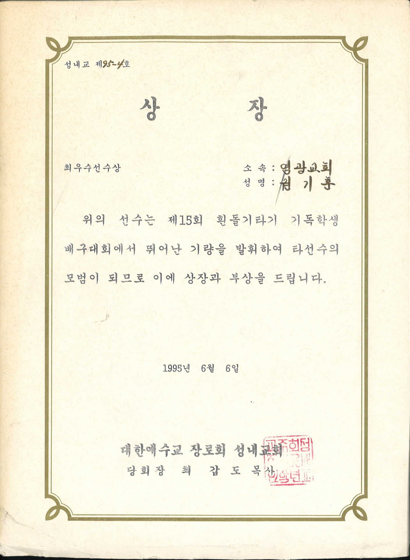 기독학생 배구대회 최우수선수 상장