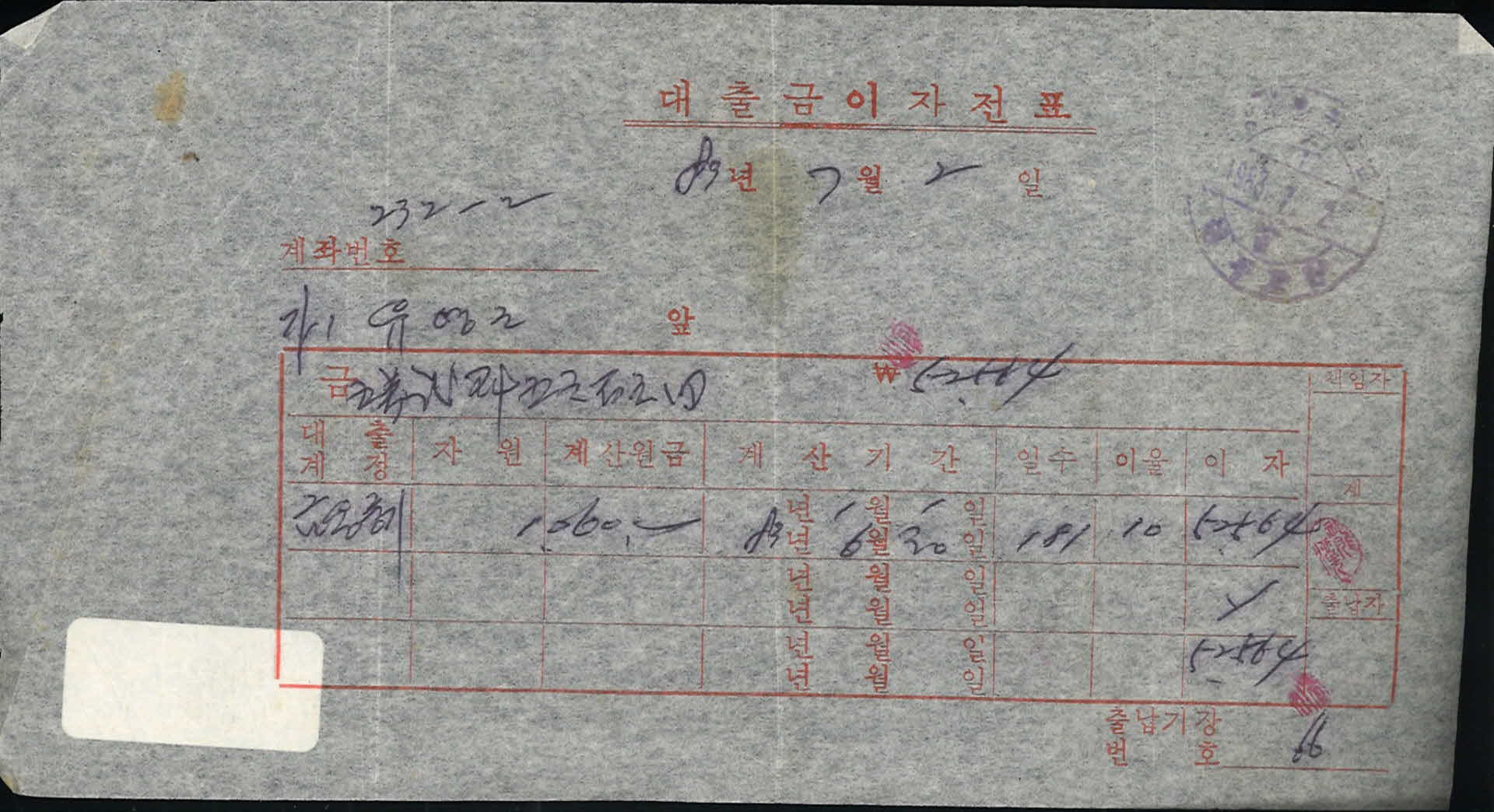 | 기록물명 | 1989년 7월 대출금이자전표 | ||