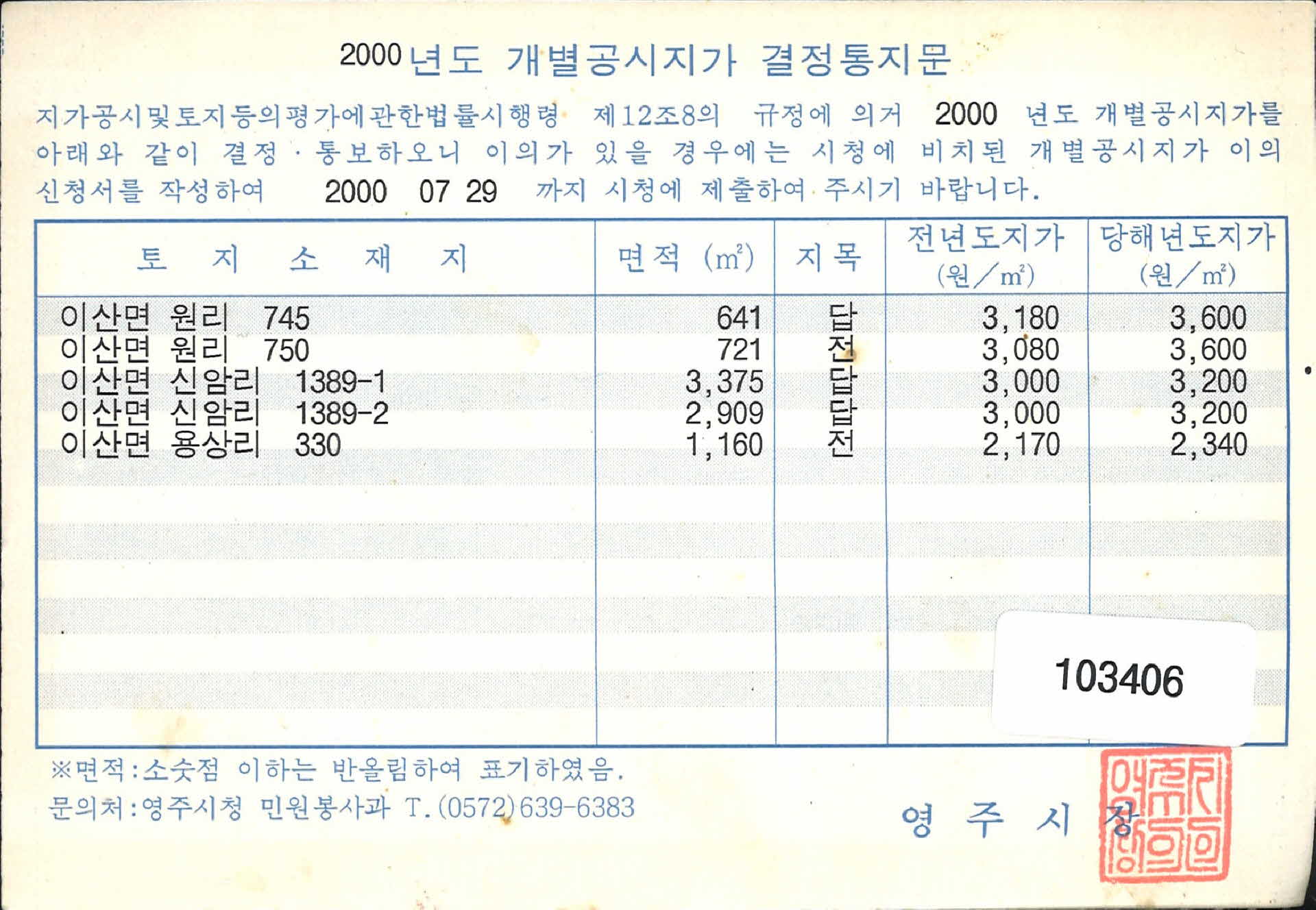 | 기록물명 | 2000년도 개별공시지가 결정통지문 | ||