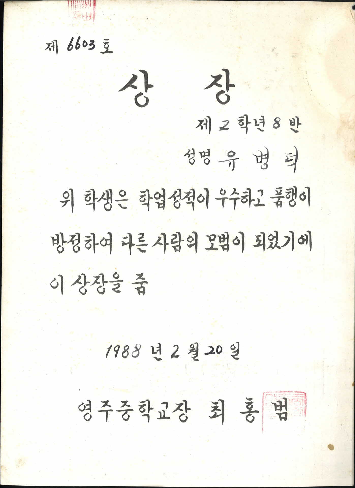 | 기록물명 | 1988년 영주중학교 학력우수 상장 | ||