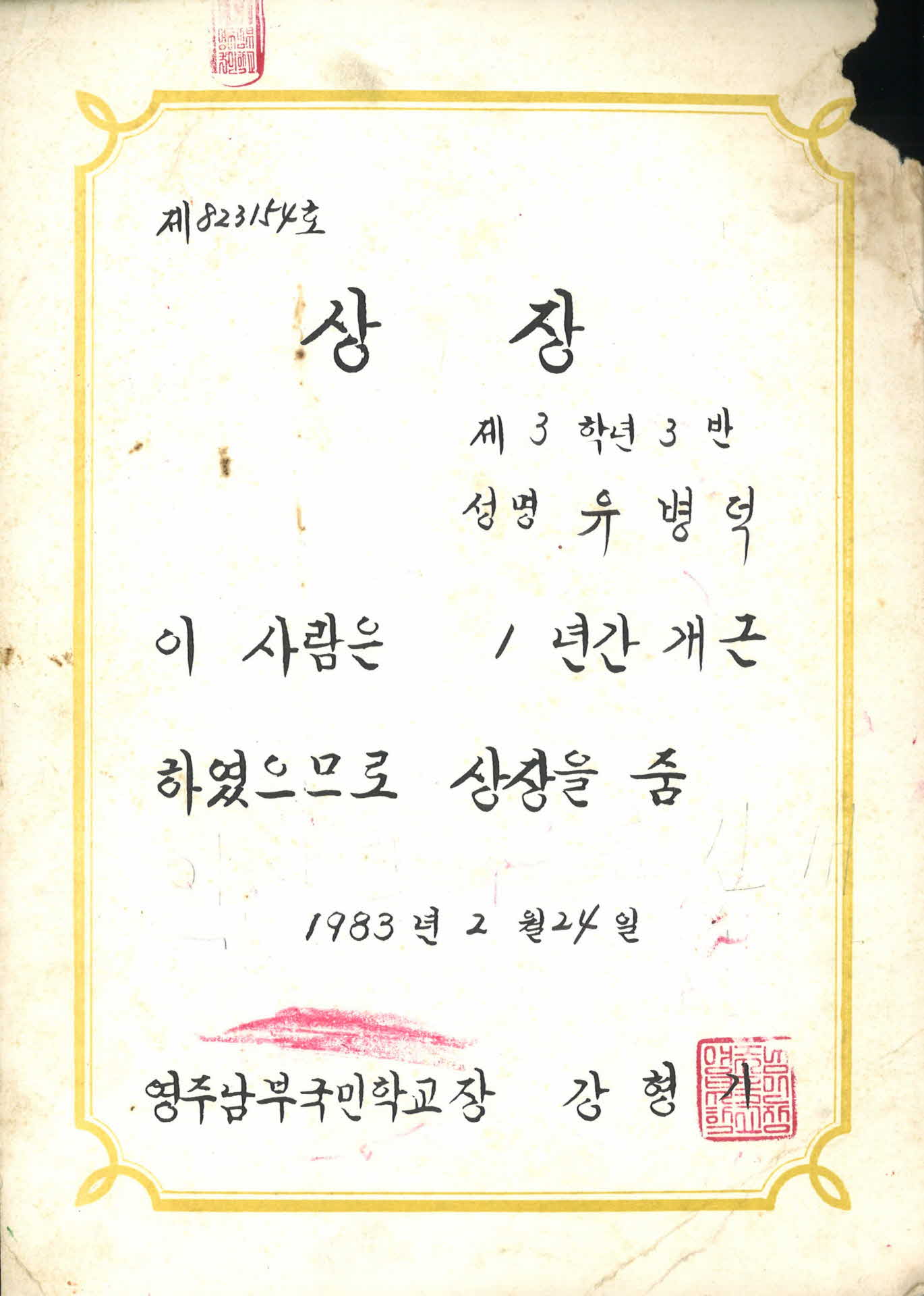 | 기록물명 | 1983년 영주남부국민학교 개근상 상장 | ||