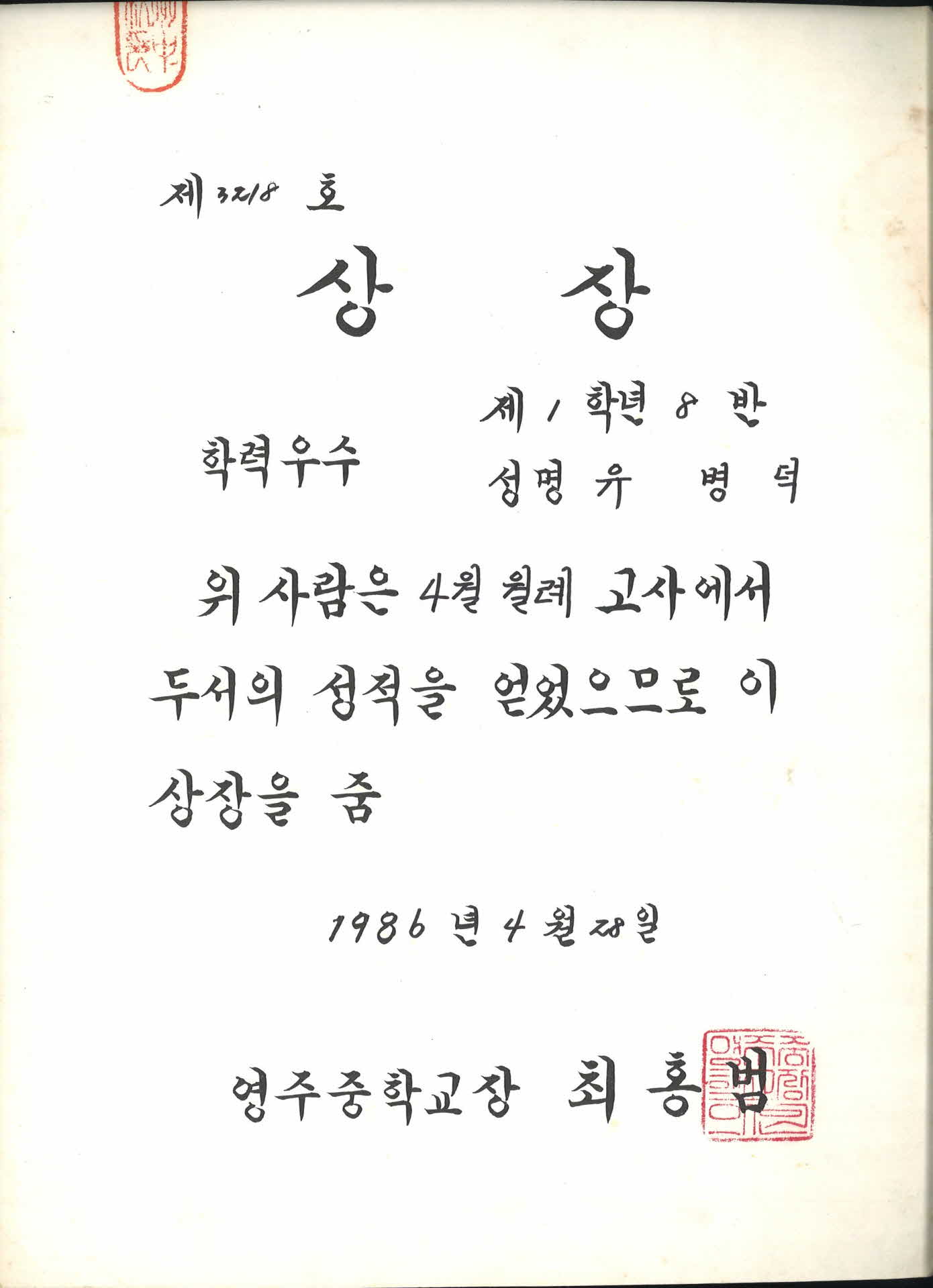 1986년 영주중학교 학력우수 상장 > 영주, 영주사람