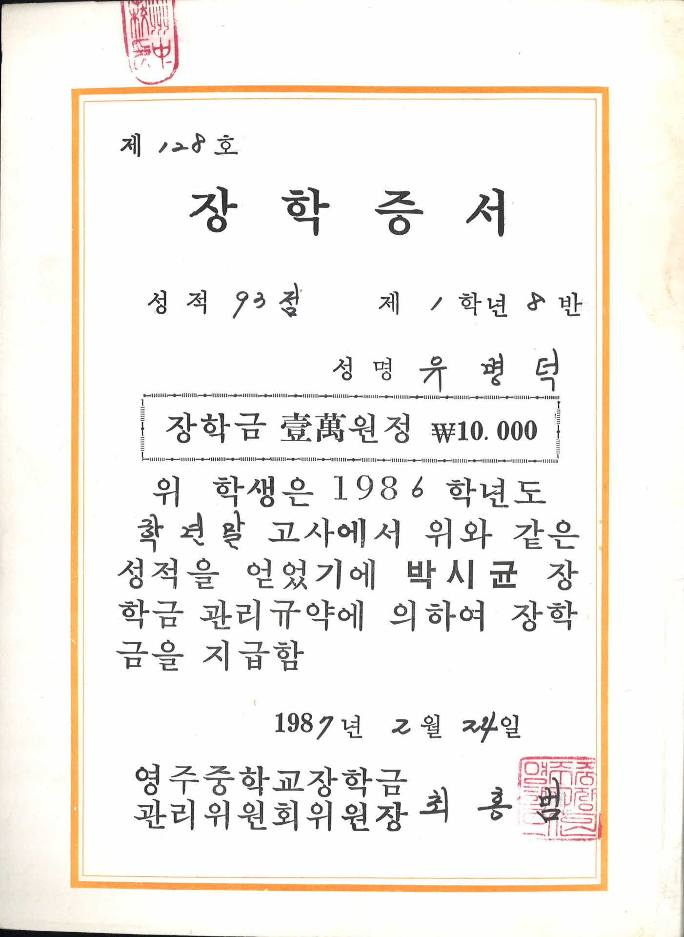1987년 영주중학교장학금관리위원회 장학금 장학증서