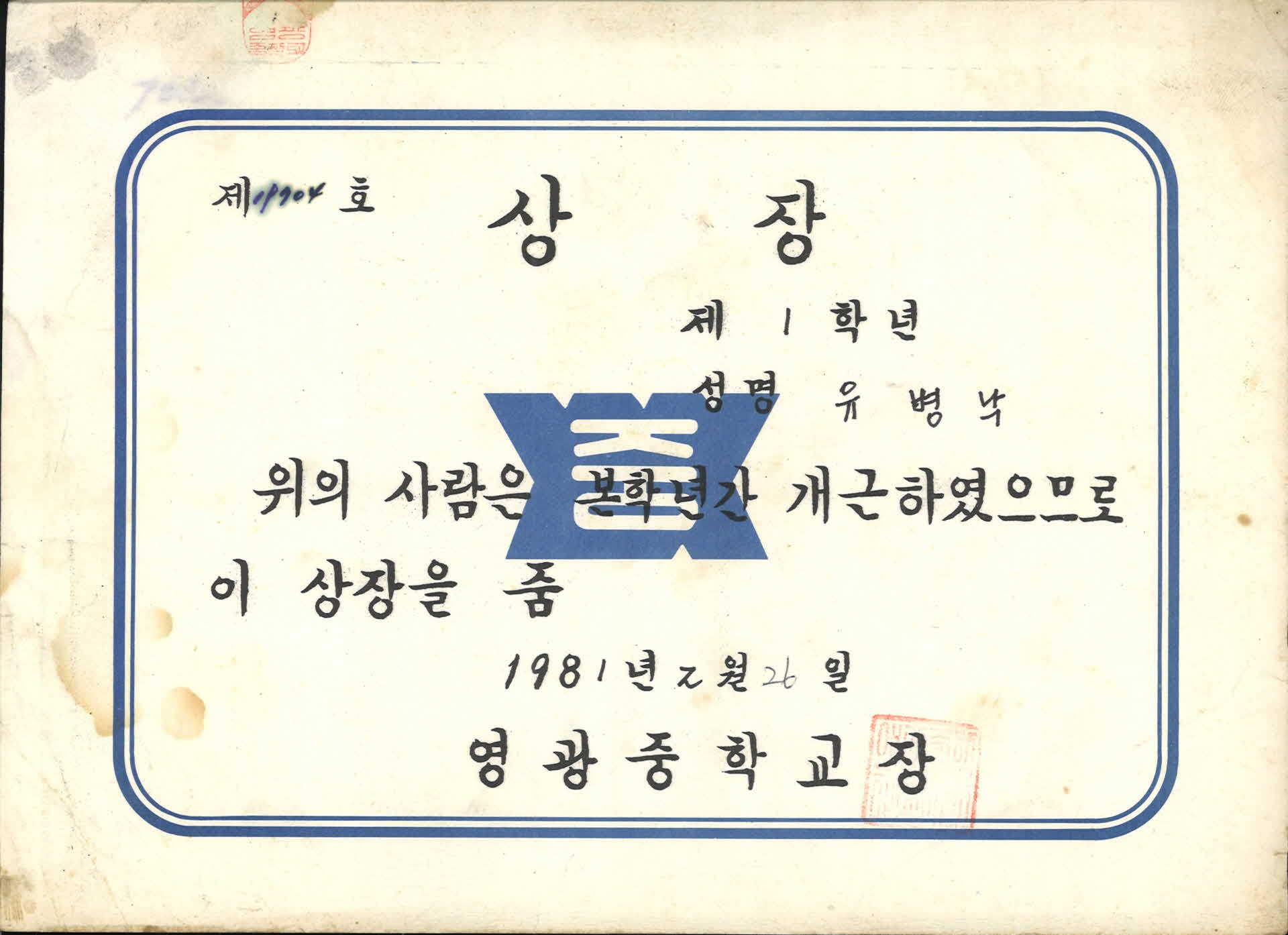 1981년 영광중학교 개근 상장