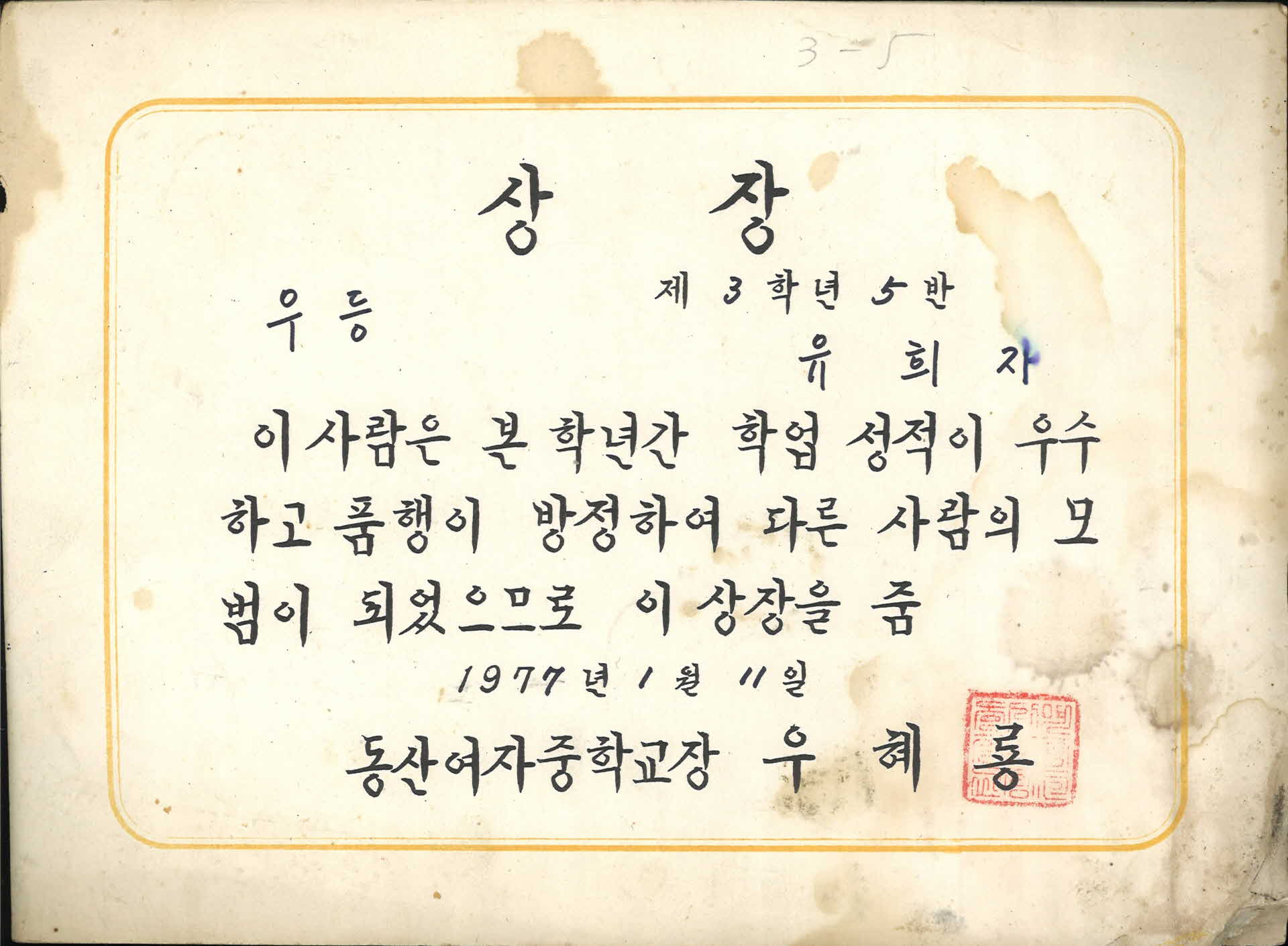 1977년 동산여자중학교 우등상 상장 > 영주, 영주사람