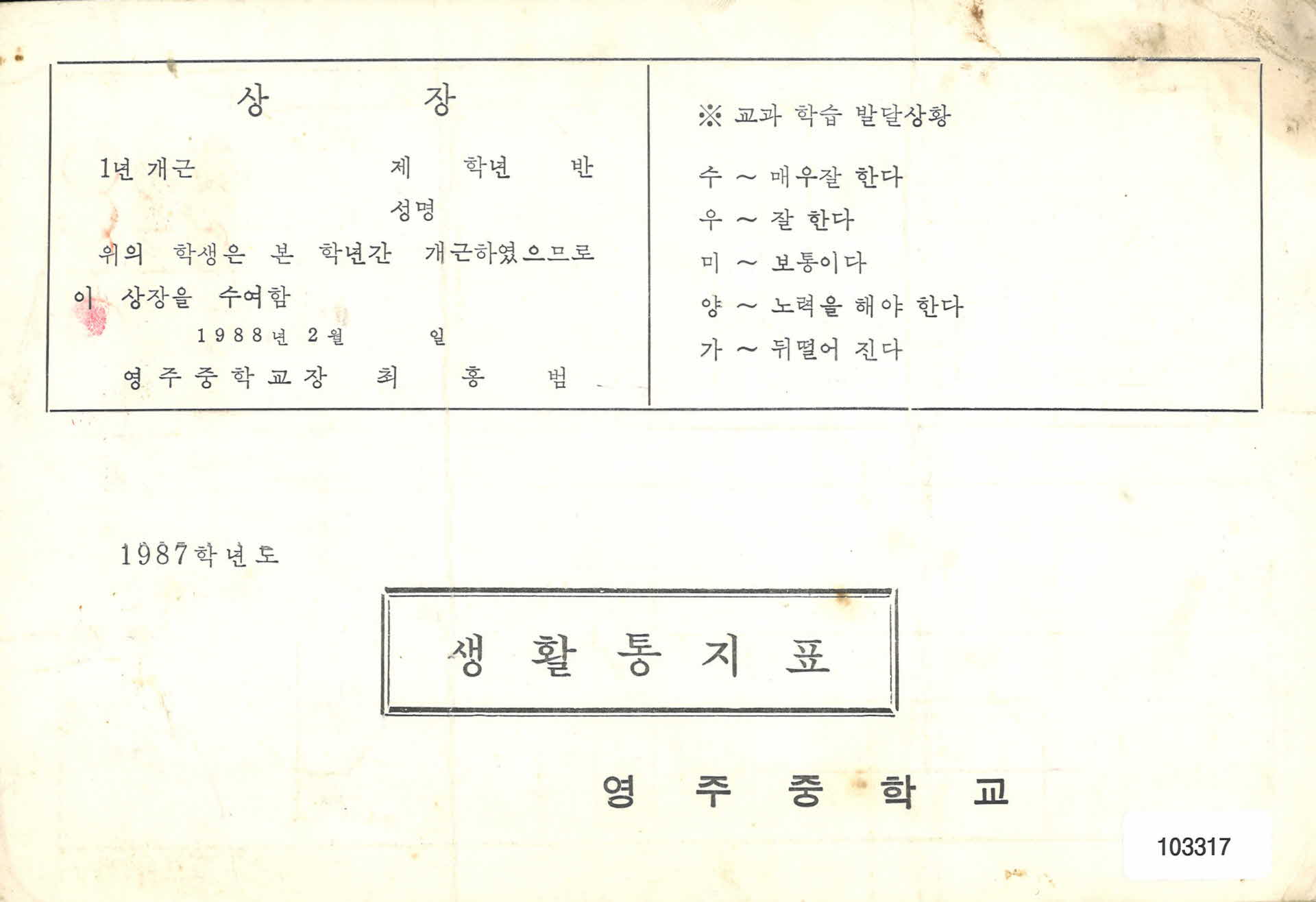 | 기록물명 | 영주중학교 생활통지표 | ||