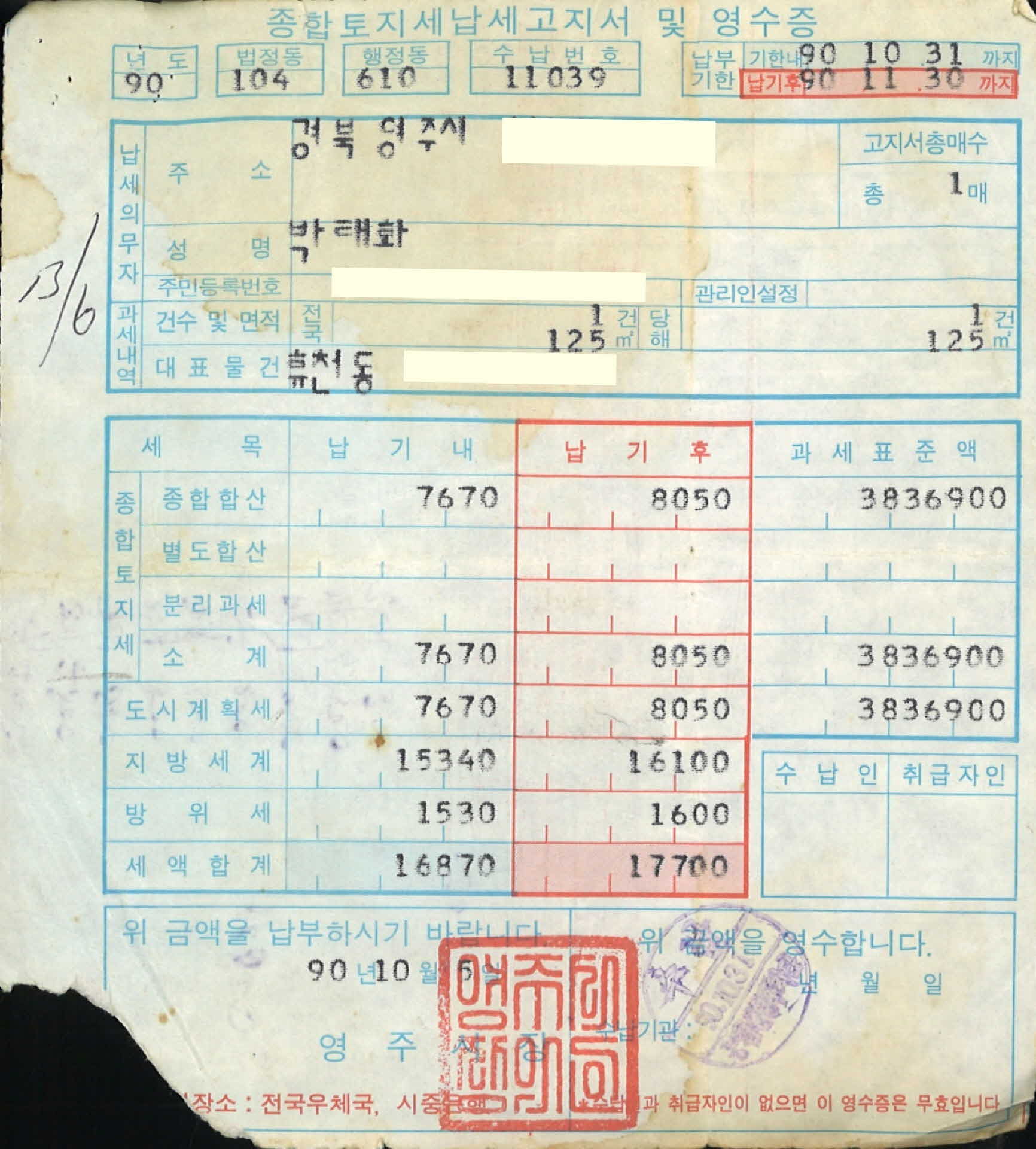 종합토지세납세고지서 및 영수증 > 영주, 영주사람
