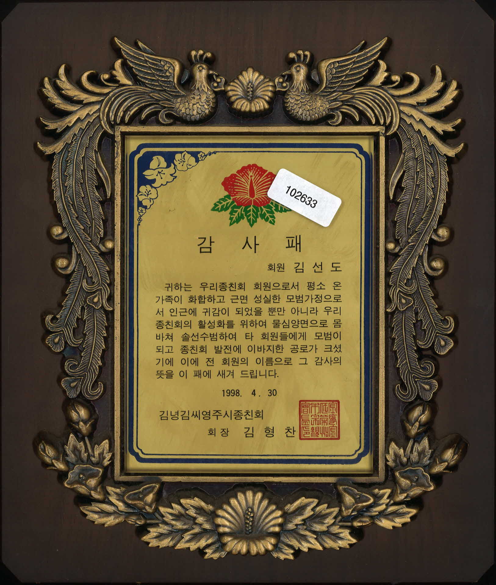 | 기록물명 | 98년 김녕김씨영주시종친회 감사패 | ||