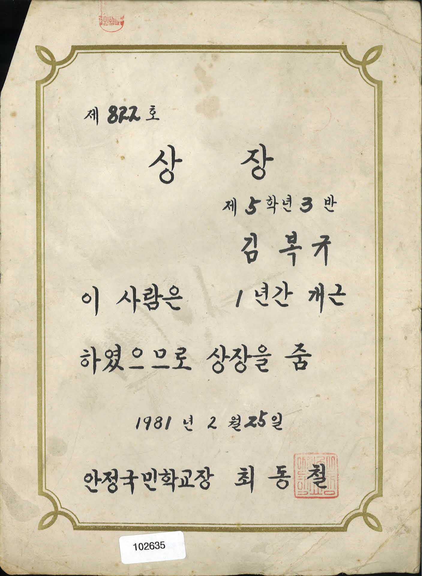 안정국민학교 1년개근상