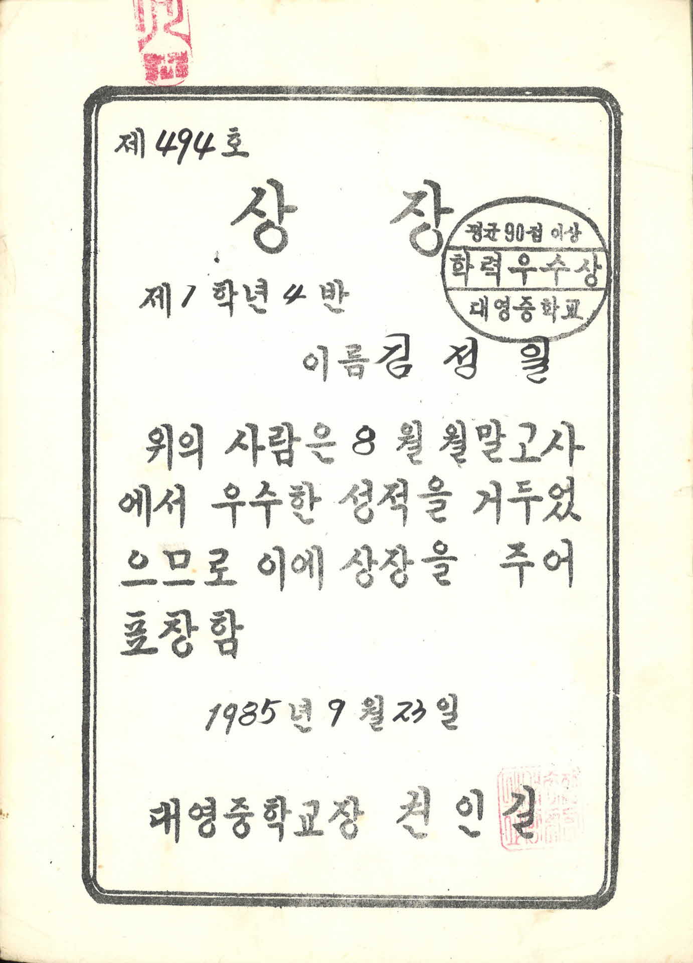 | 기록물명 | 대영중학교 8월말고사 우수성적 상장 | ||