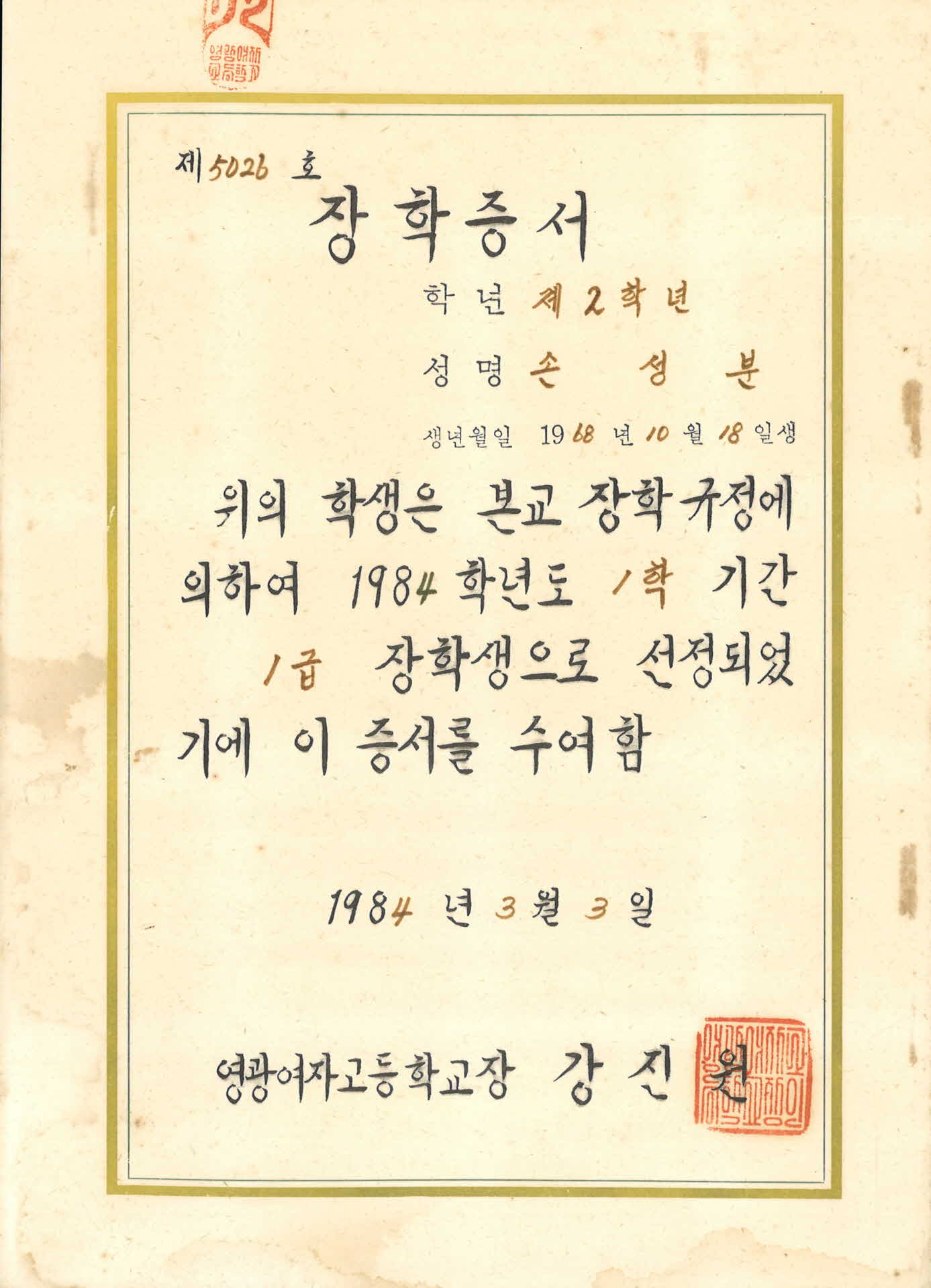 | 기록물명 | 1학기 1급 장학증서 | ||