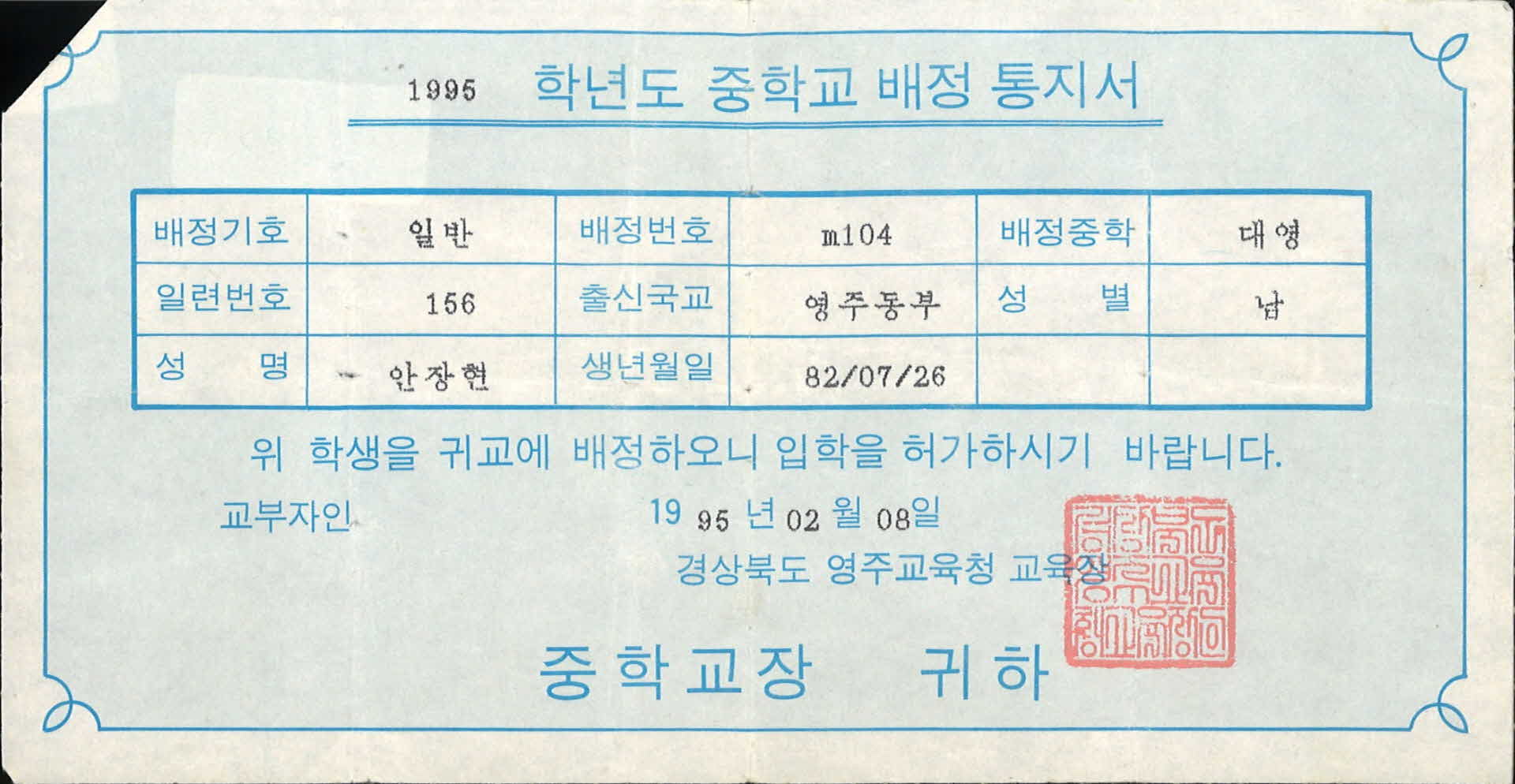| 기록물명 | 영주교육청 1995학년도 중학교 배정 통지서 | ||
