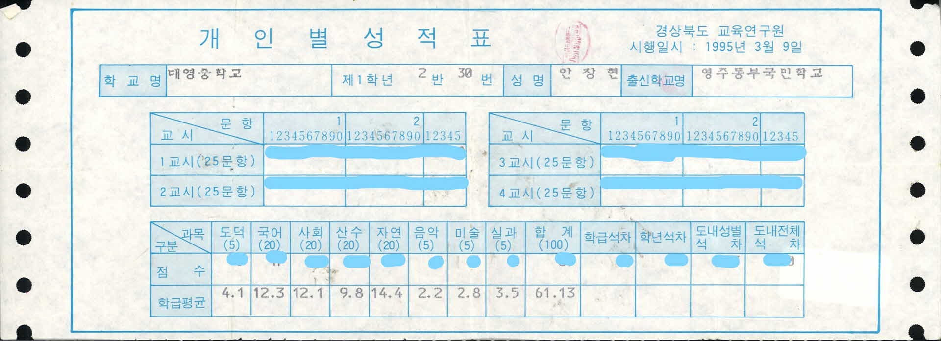 | 기록물명 | 대영중학교 개인별 성적표 | ||