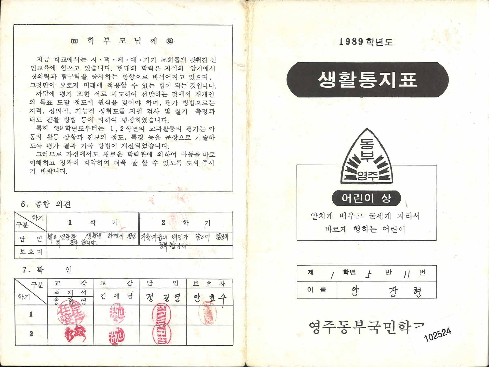 1989년 영주동부초등학교 생활통지표