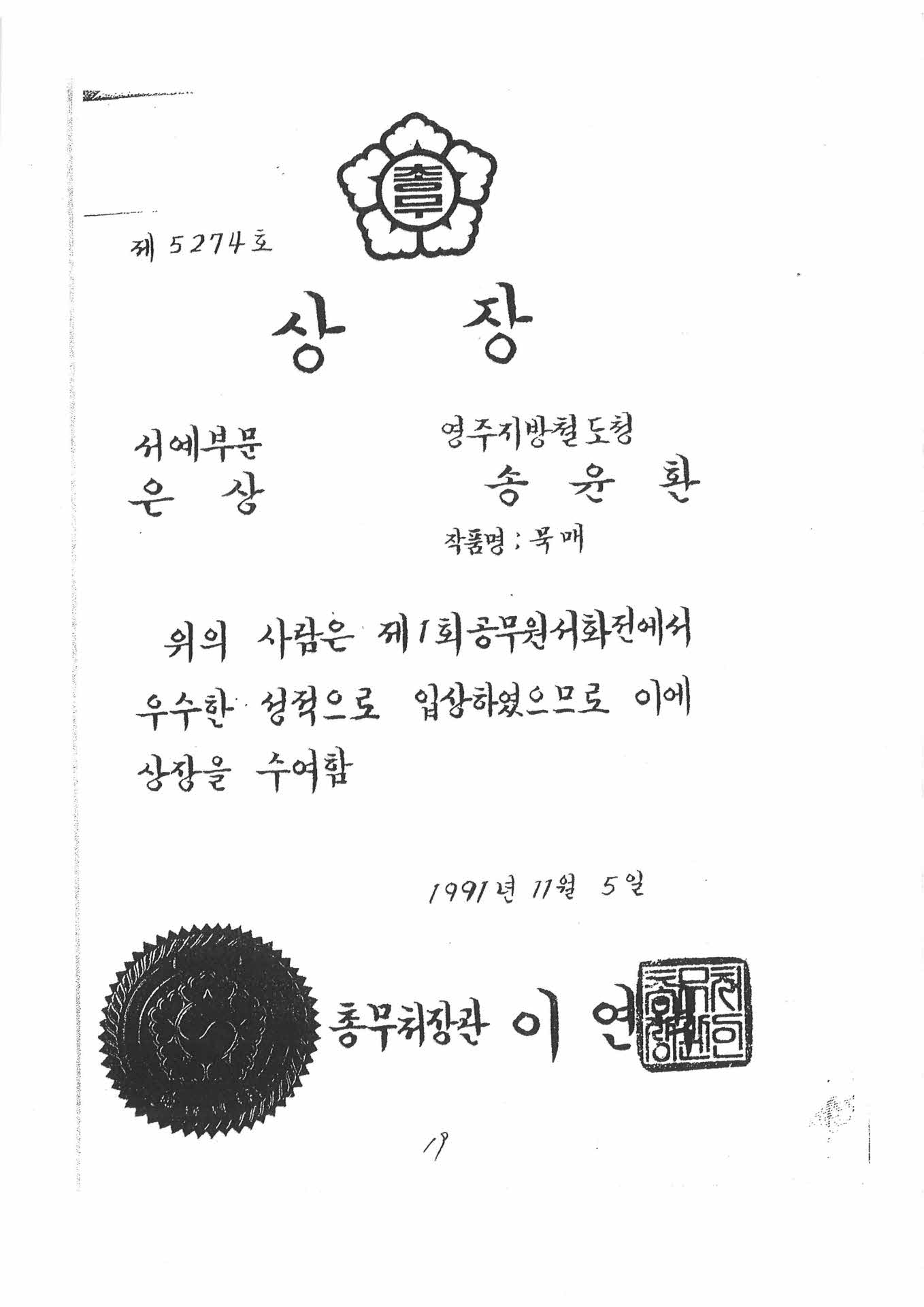 | 기록물명 | 제1회 공무원 서화전 상장 ( 은상 ) | ||