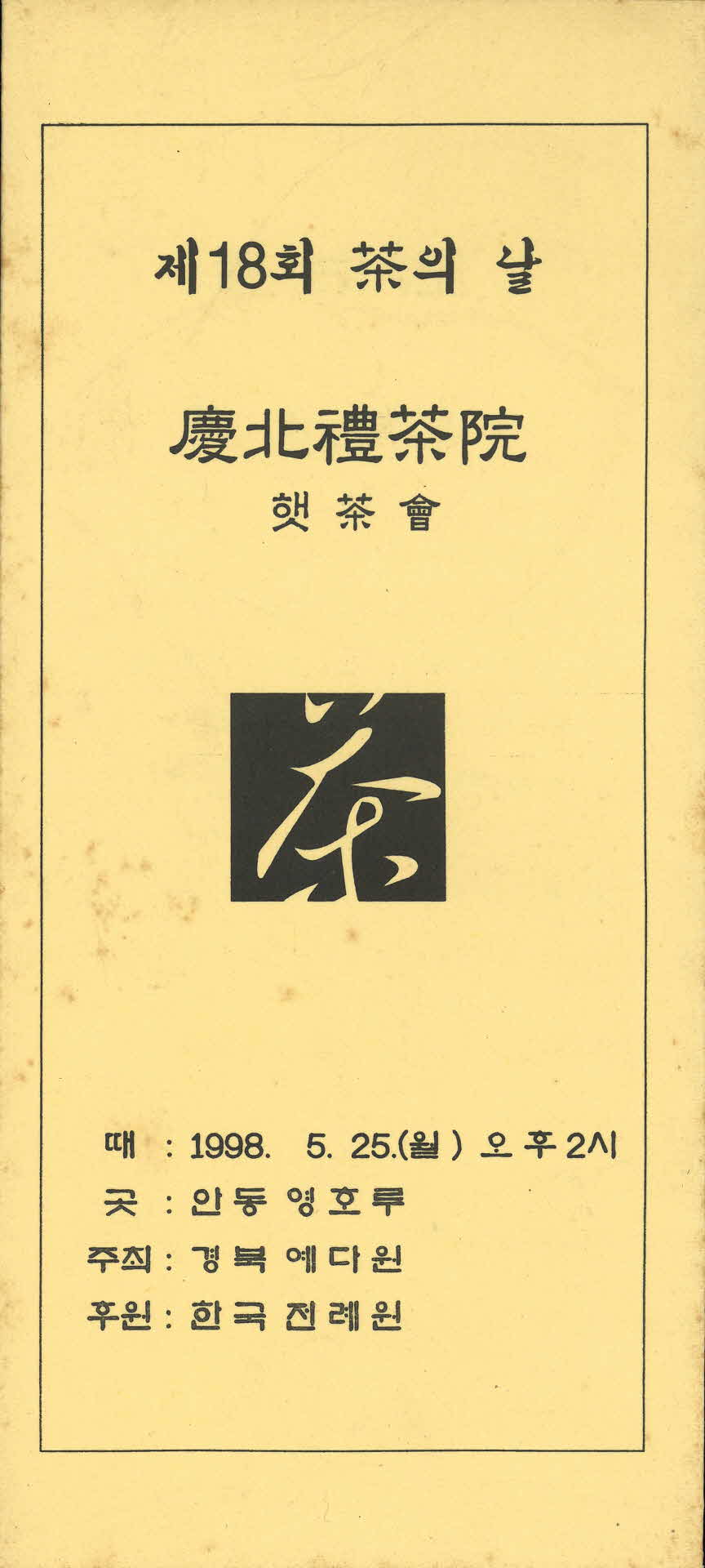 1998년 5월 25일 오후 2시에 안동 영호루에서 경북 예다원이 주최하고 한국전례원이 후원하는 제18회 차의 날 경북예다원(慶北禮茶院) 햇차회 안내 팜플렛이다. 경북 13개 시군에서 참여하며, 모시는 분으로는 중요무형문화재이며 문경 영남요의 백산(白山) 김정옥(金正玉)과 불교 선묵회 초대 회장이자 속리산 달마선원 주지인 범주(梵舟)스님으로 되어 있다.