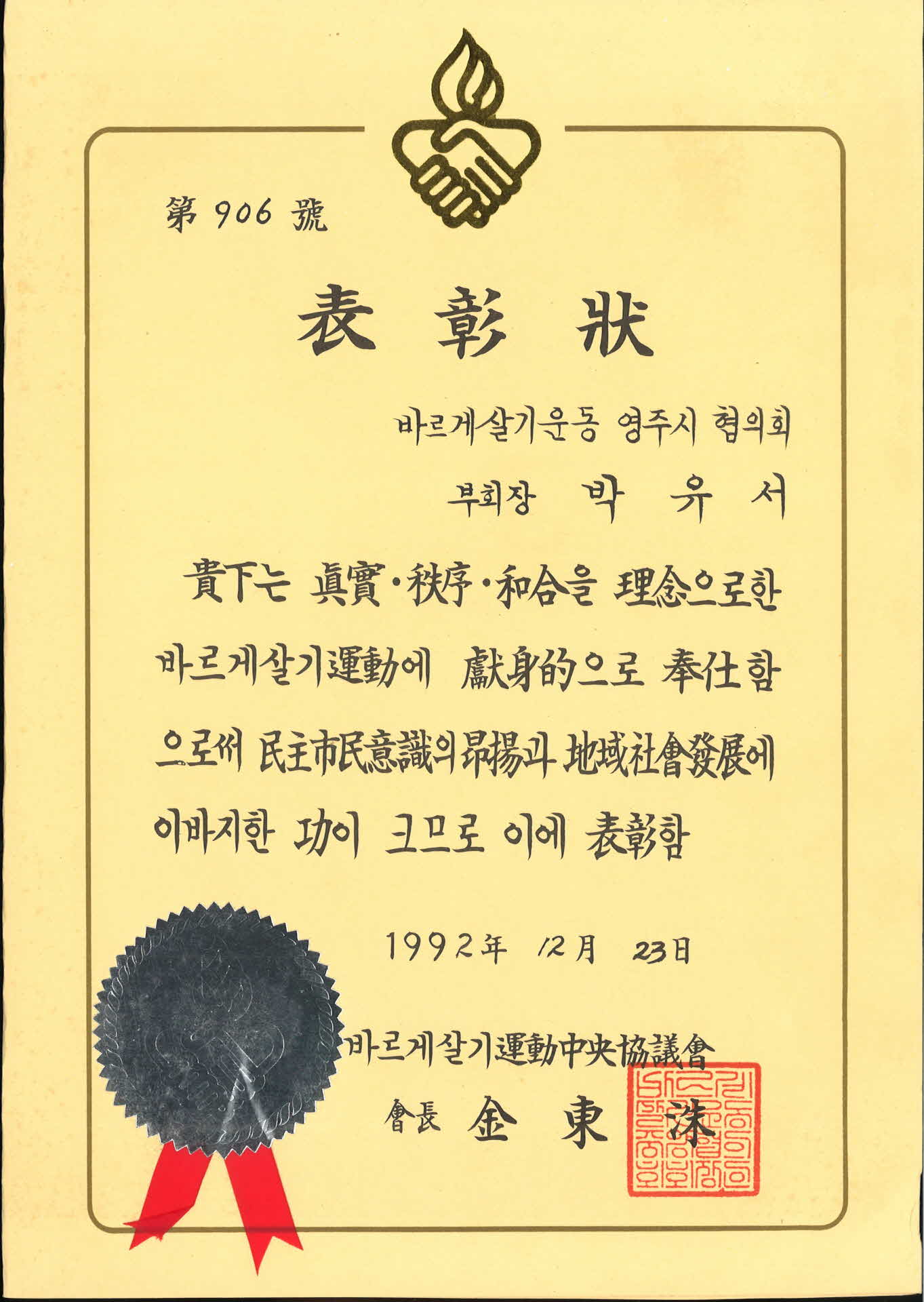 | 기록물명 | 바르게살기운동중앙협의회표창장 | ||