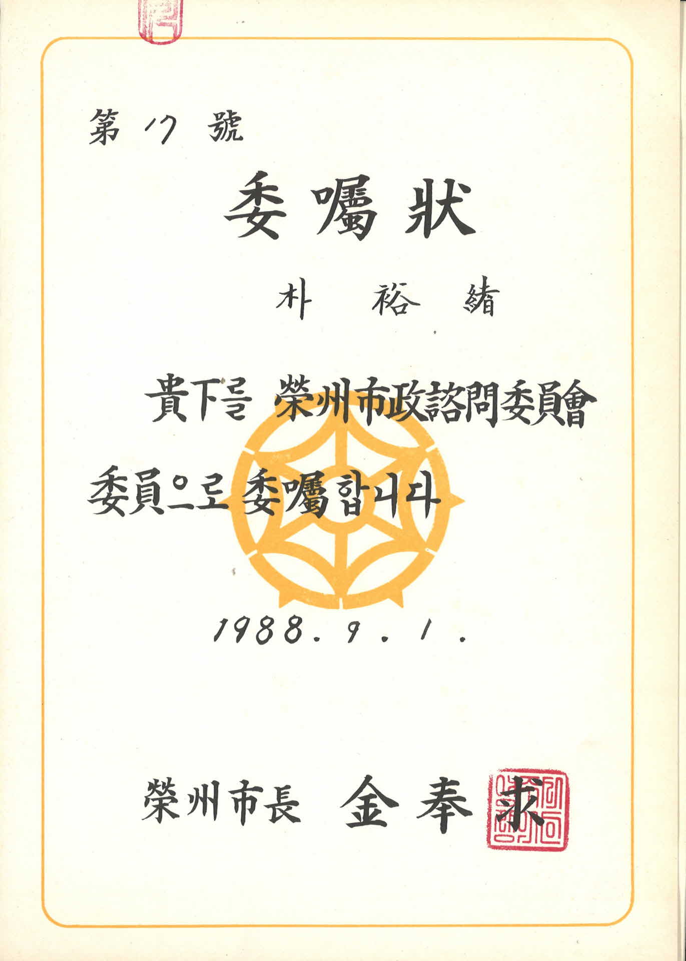 | 기록물명 | 영주시정자문위원회위촉장 | ||