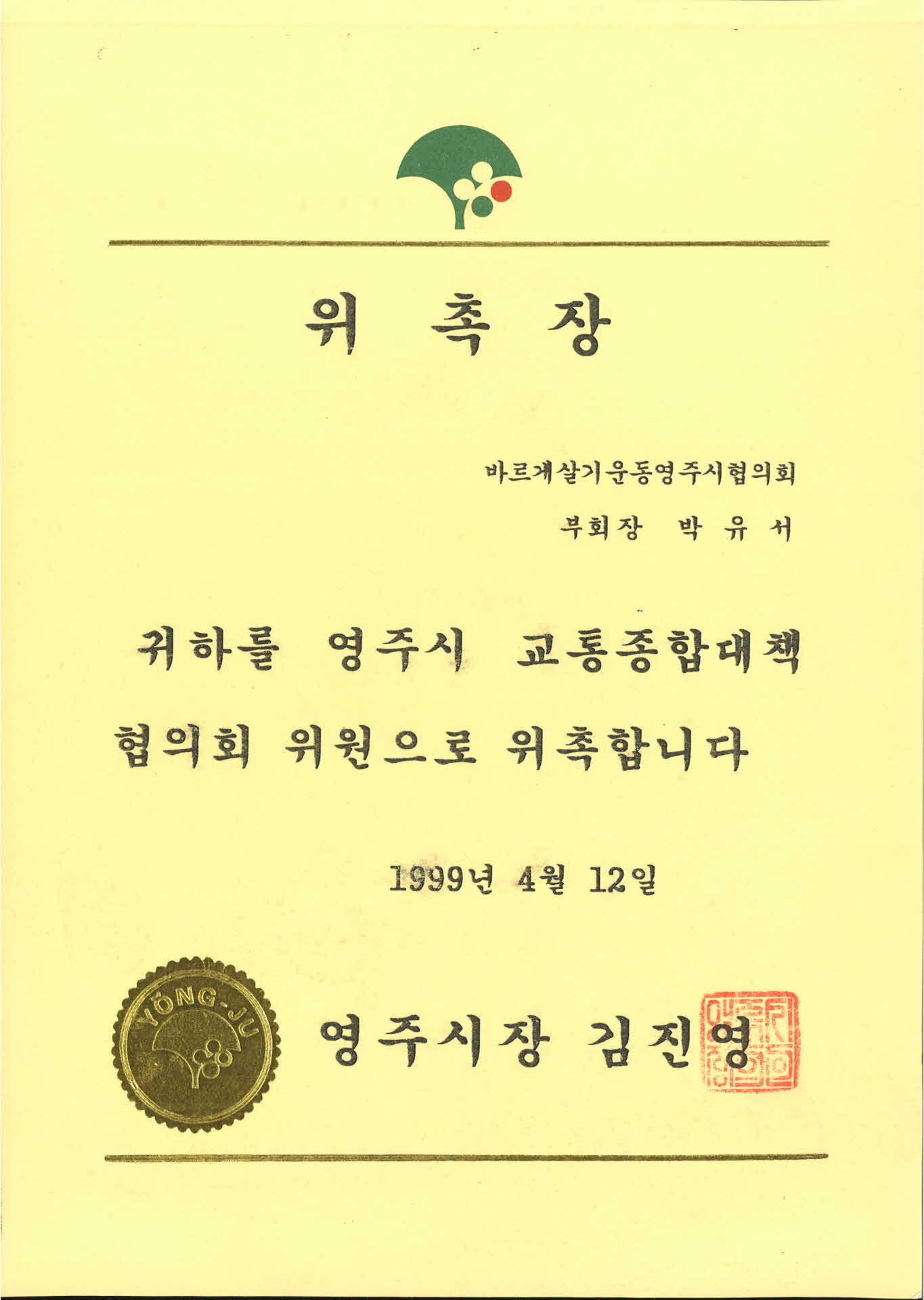 영주시교통종합대책협의회위원위촉장 > 영주, 영주사람