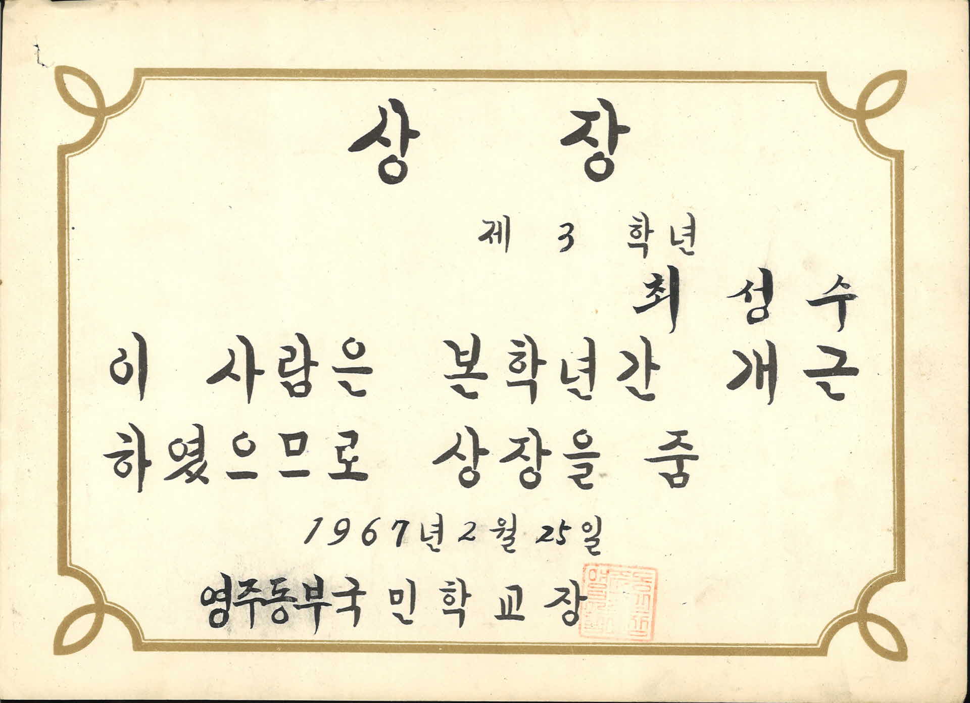 영주동부국민학교 1년 개근 상장 > 영주, 영주사람