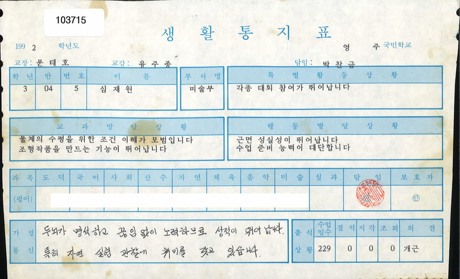 | 기록물명 | 영주국민학교 생활통지표 | ||