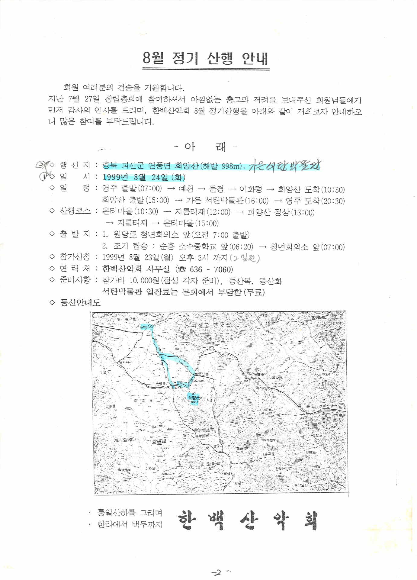 한백산악회장이 보낸 8월 정기 산행 안내문이다. 일시는 1999년 8월 24일이며, 장소는 괴산군 희양산과 가은 석탄박물관이다. 출발 장소는 원당호 청년회의소 앞이며, 참가비는 10,000원으로 되어 있으며, 각자의 등산에 필요한 장비와 중식을 준비하라고 안내되어 있다. 희양산은 백두대간의 산이다. 괴산군과 문경시 가은읍과 경계를 이루고 있다. 동, 서, 남 3면이 화강암 암벽으로 이루어진 높이 999m의 거대한 돌산이다. 빼어난 경치와 신라 헌강왕 5년(879) 창건한 천년고찰 봉암사를 안고 있다.