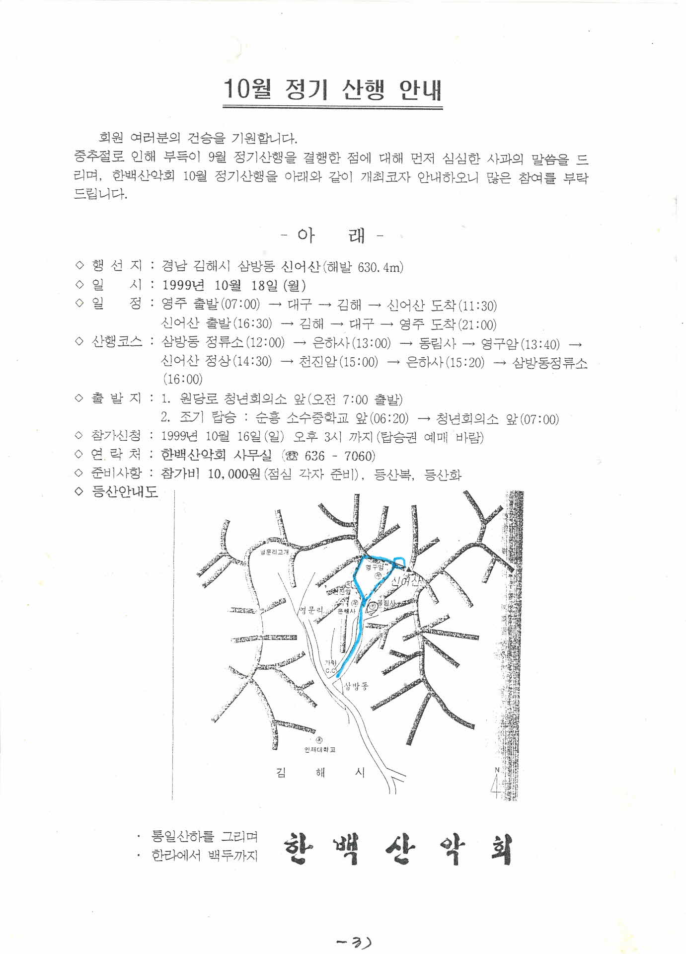한백산악회장이 보낸 10월 정기 산행 안내문이다. 일시는 1999년 10월 18일이며, 장소는 김해시 신어산이다. 출발 장소는 원당호 청년회의소 앞이며, 참가비는 10,000원으로 되어 있으며, 각자의 등산에 필요한 장비와 중식을 준비하라고 안내되어 있다. 두 마리 물고기를 뜻하는 신어산은 높이가 해발 630.4m이다. 능선에서 김해시가지를 바라보면서 산행할 수 있어 올라가는 재미가 있고, 기암절벽 사이로는 구름다리가 있어 산행을 더욱 즐겁게 한다. 북동쪽으로는 낙동강이 감돌아 흐르고 남쪽에는 광활한 김해평야가 펼쳐져 있으며, 가락국의 시조 김수로왕 탄강지로 전해오는 구지봉이 서쪽 끝부분에 있다.