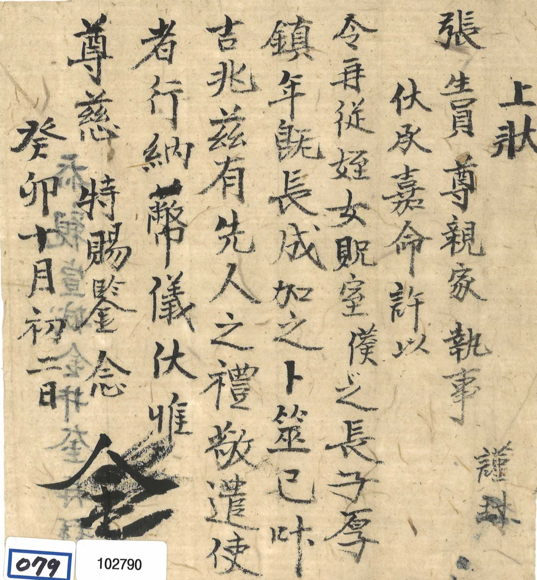 후진의 혼서. 아버지 정규가 사돈되는 장생원에게 보냄