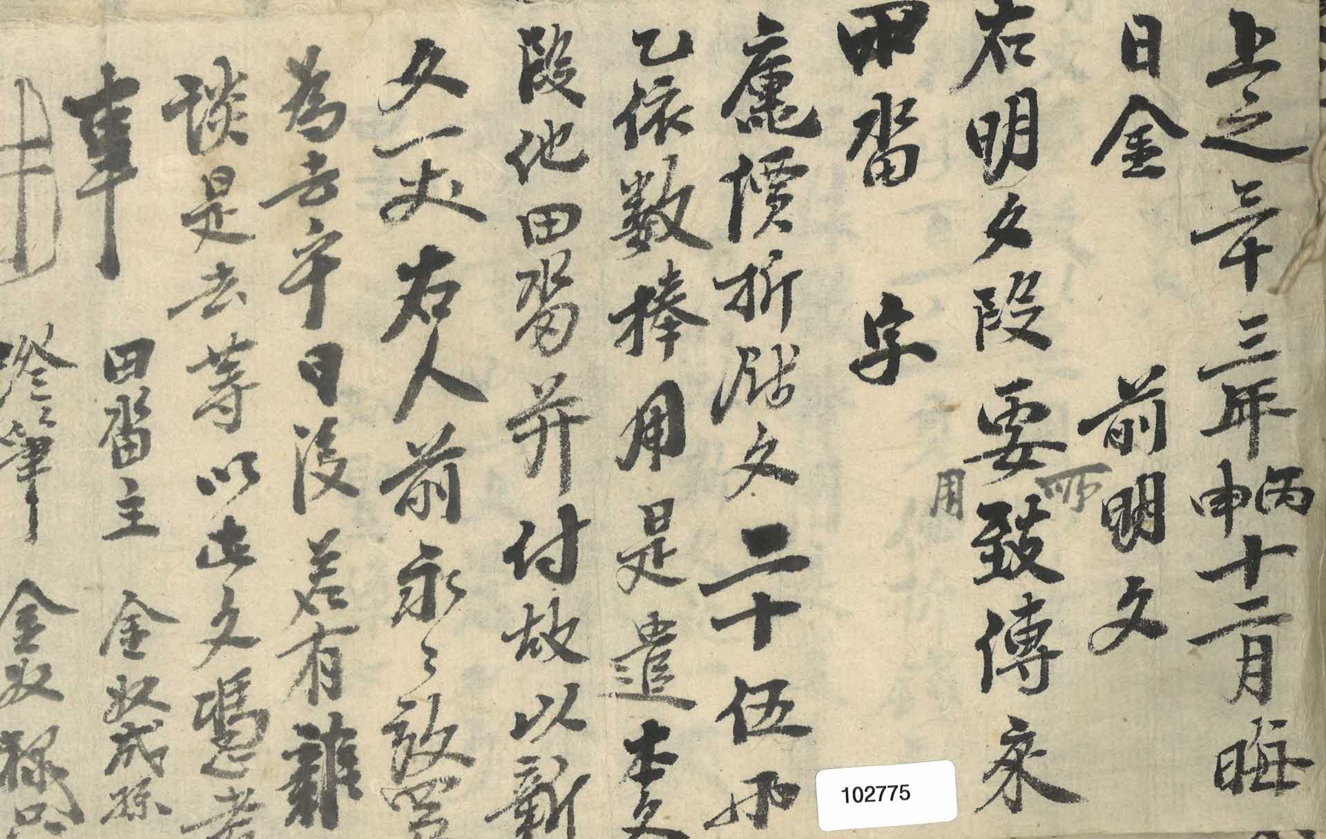 - 다음글 명문 - 坊靑員 稱 字 토지 3두락에 대한 매도 영스증이다. 매수인은 稧中'이라 하여 개인이 아님을 알 수 있고 매도인이 명기하지 않는다.