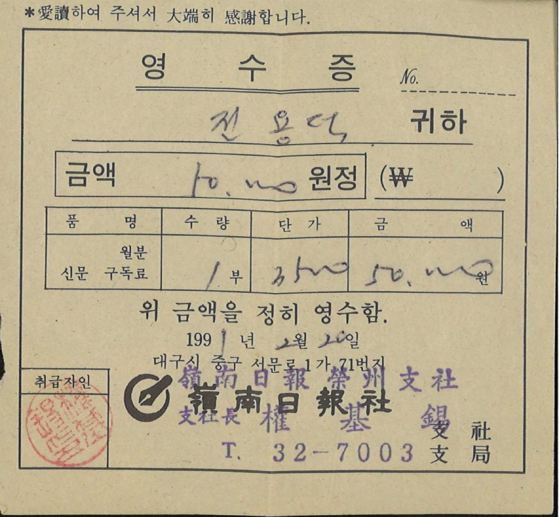 영남일보사 영수증