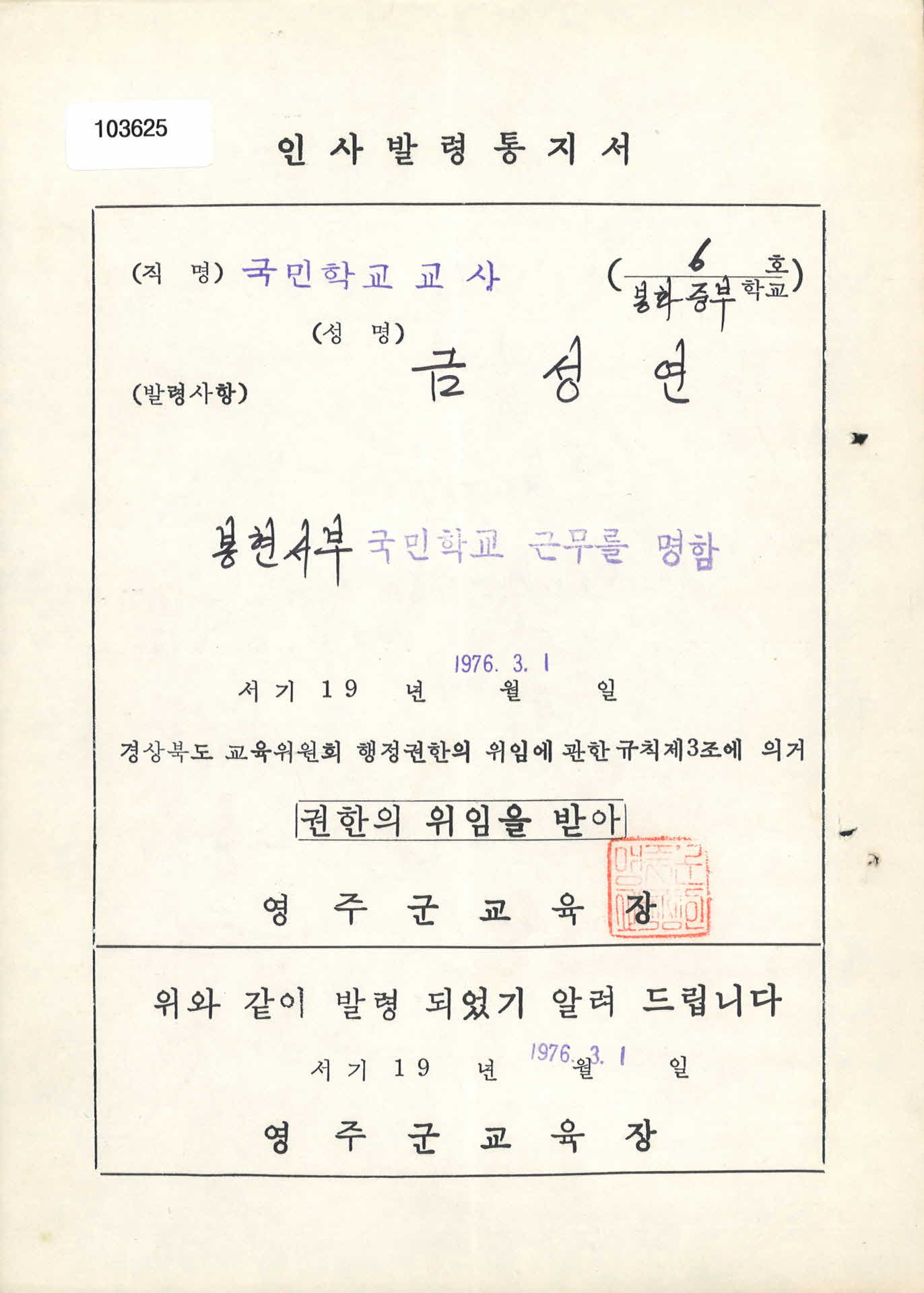 | 기록물명 | 교사 인사발령통지서 | ||