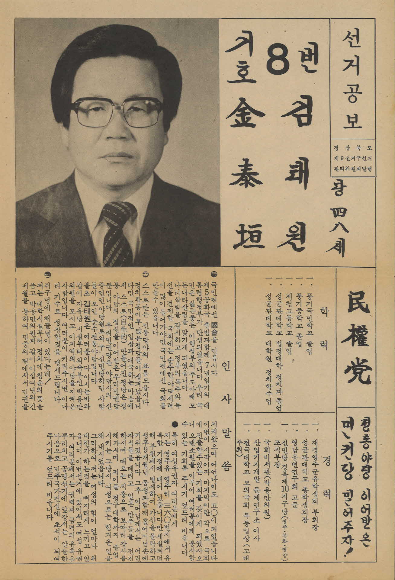 | 기록물명 | 김태원 민권당 총선 선거공보 | ||