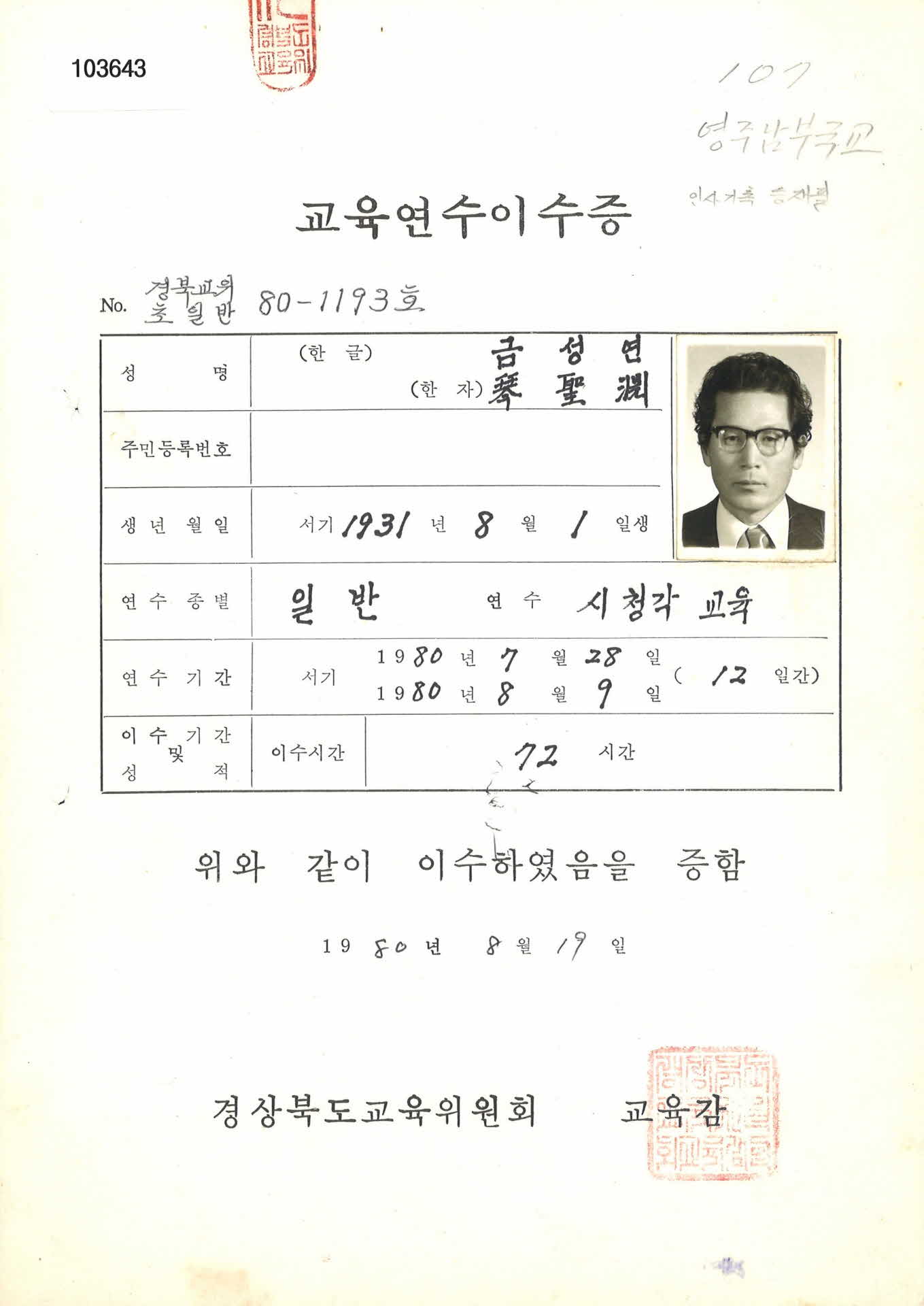 | 기록물명 | 경상북도 교육위원회 교육연수이수증 | ||