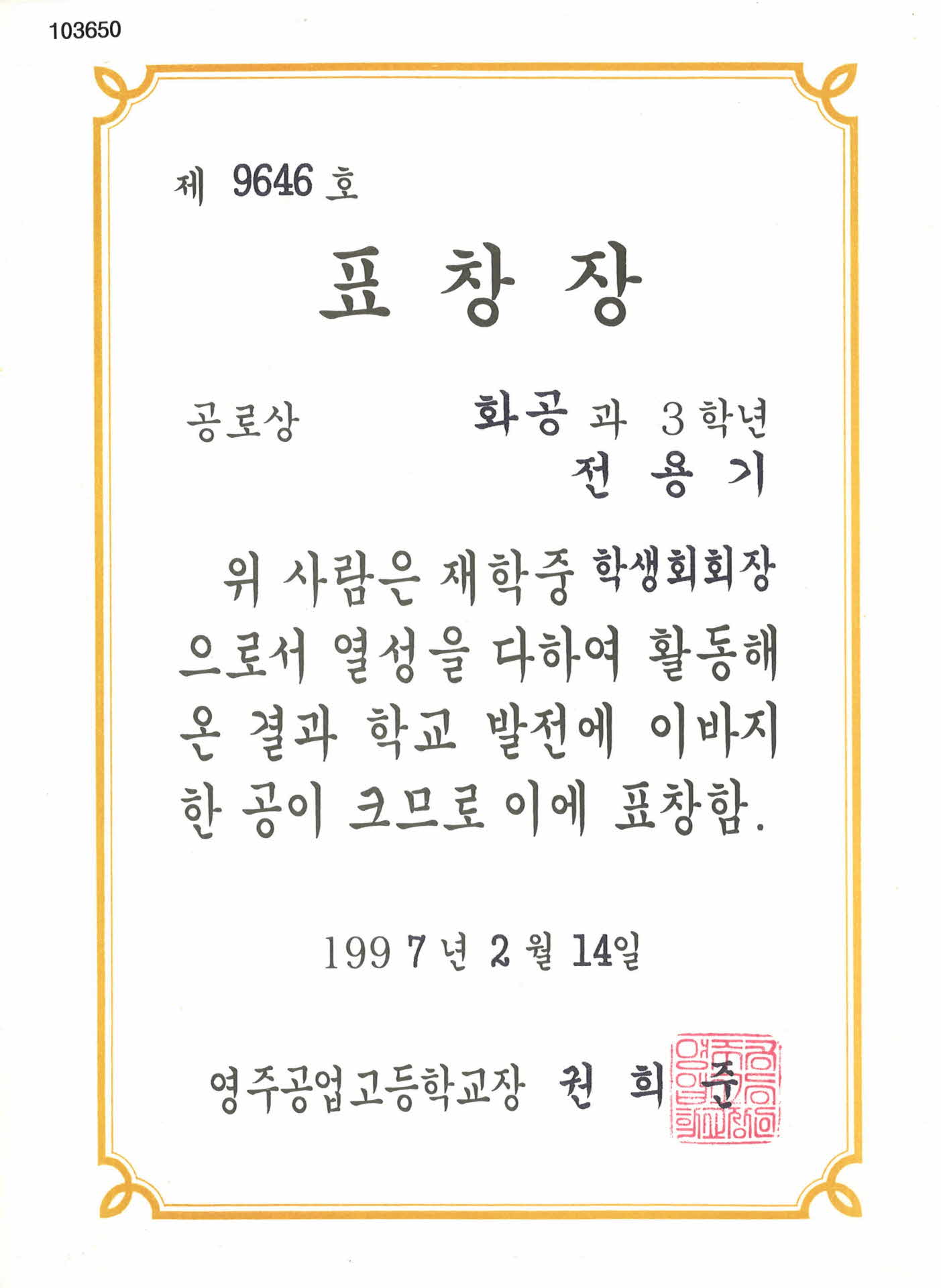 | 기록물명 | 영주 공업고등학교 학생회 회장 표창장 | ||