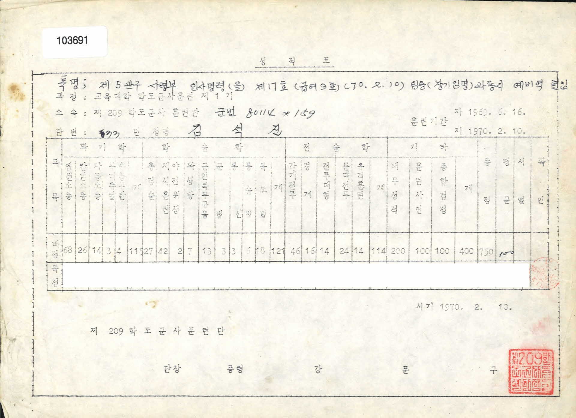 | 기록물명 | 군사훈련단 성적표 | ||