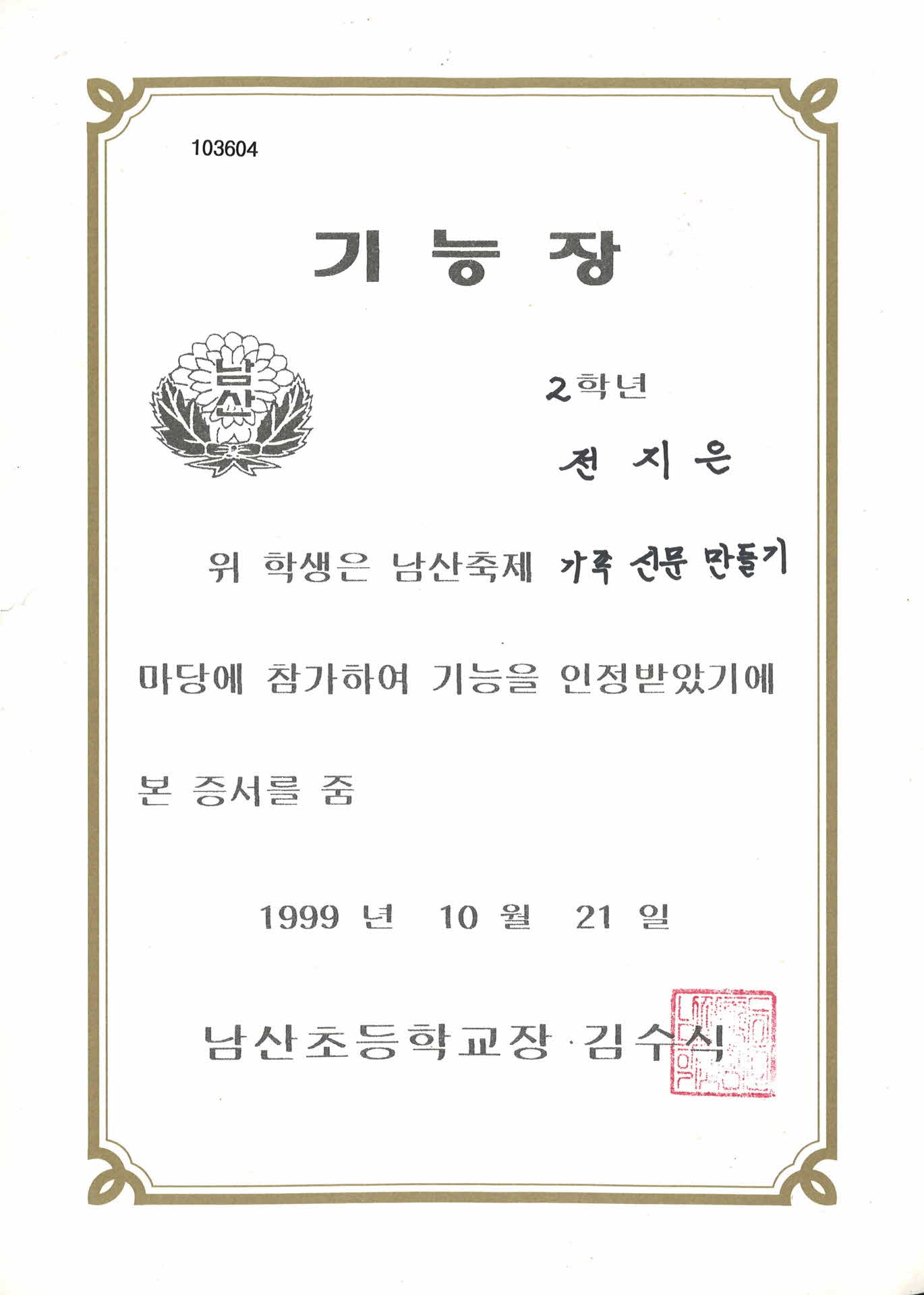 | 기록물명 | 남산초등학교 독후감분야 기능장 증서 | ||