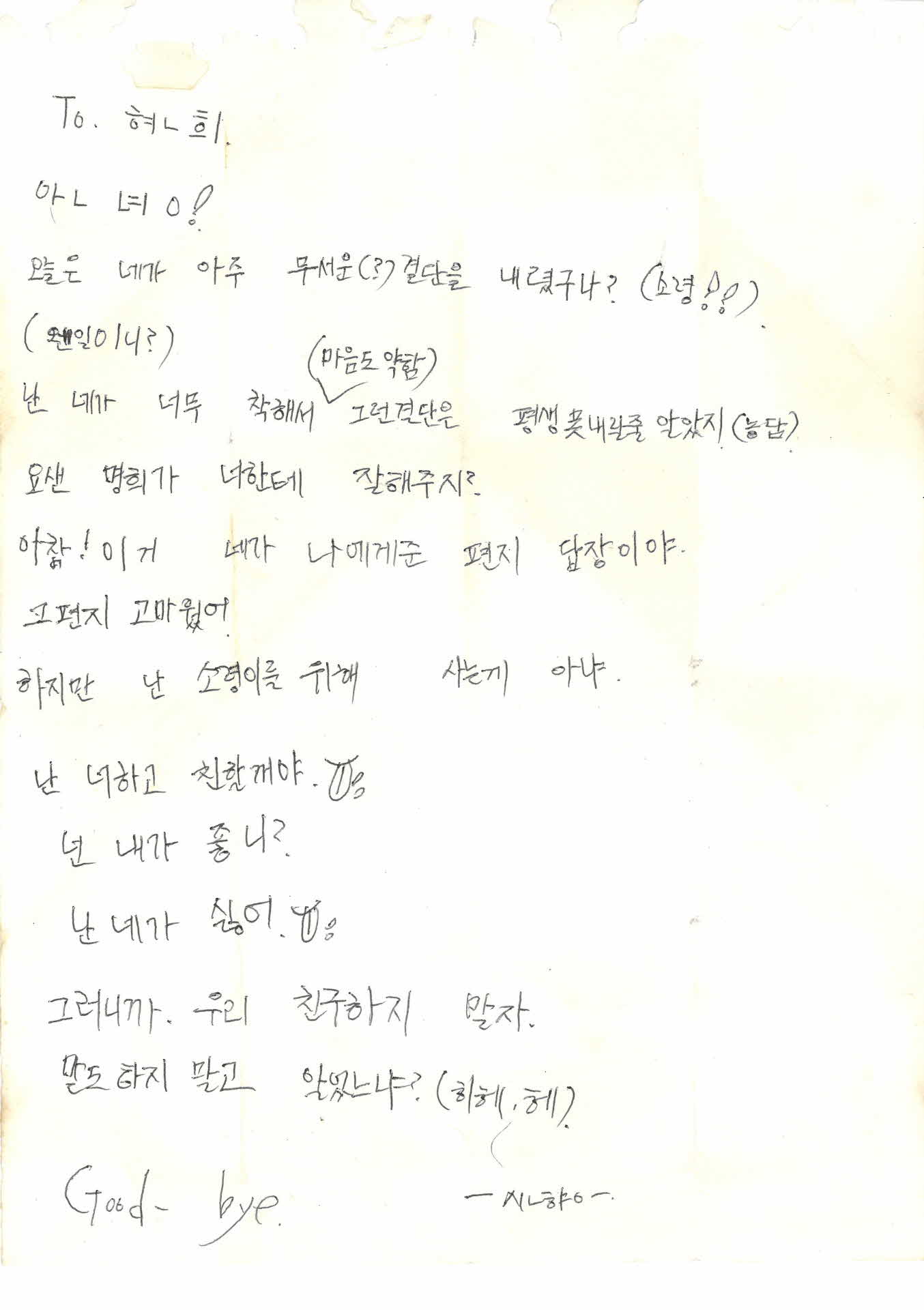 신향 학생이 현희 학생에게 보낸 편지이다. 답장으로 썼으며, 소령 학생과의 관계 정리와 현희와 더 친하고 싶은 마음을 반어법으로 표현했다.