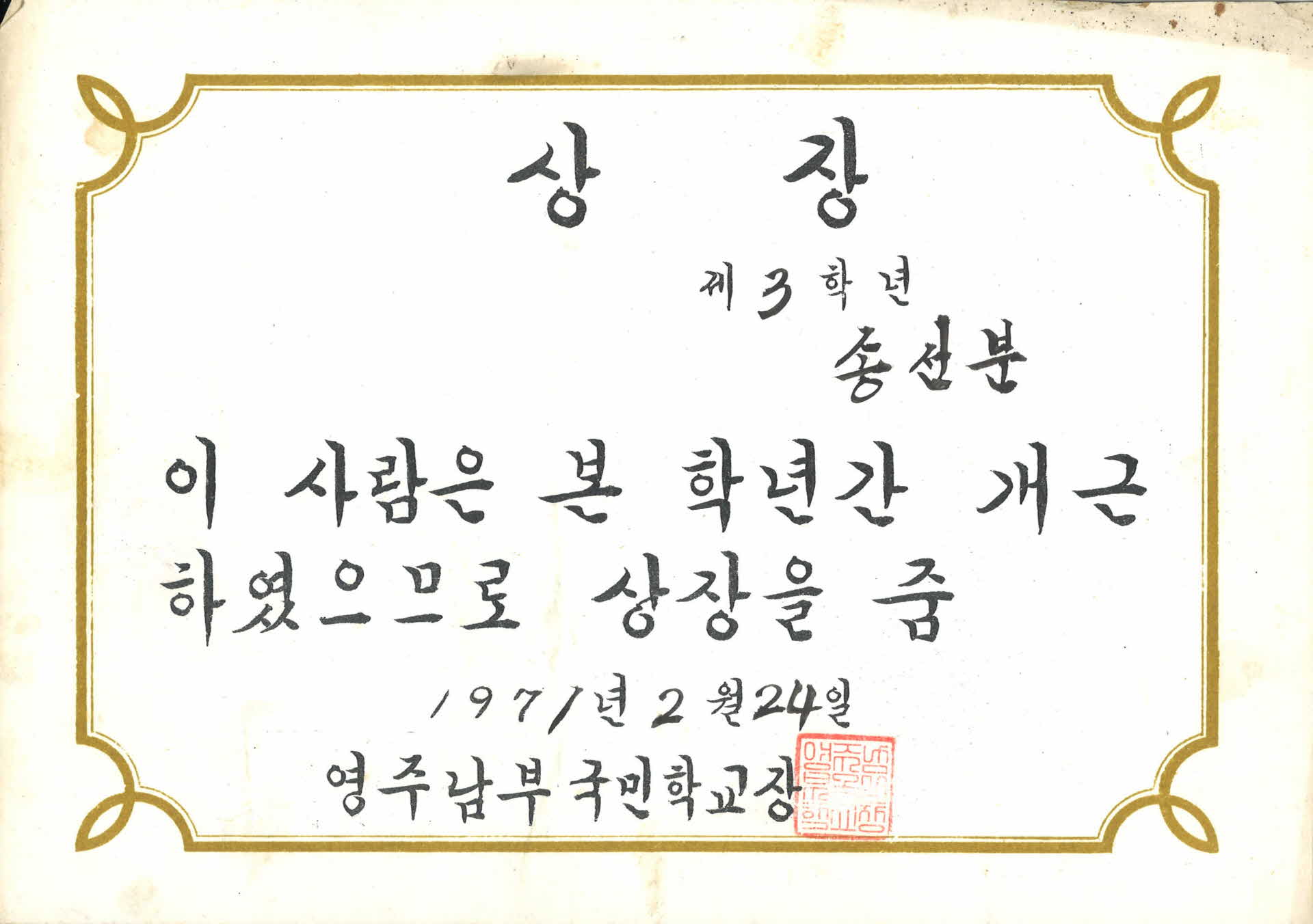 영주남부국민학교 상장