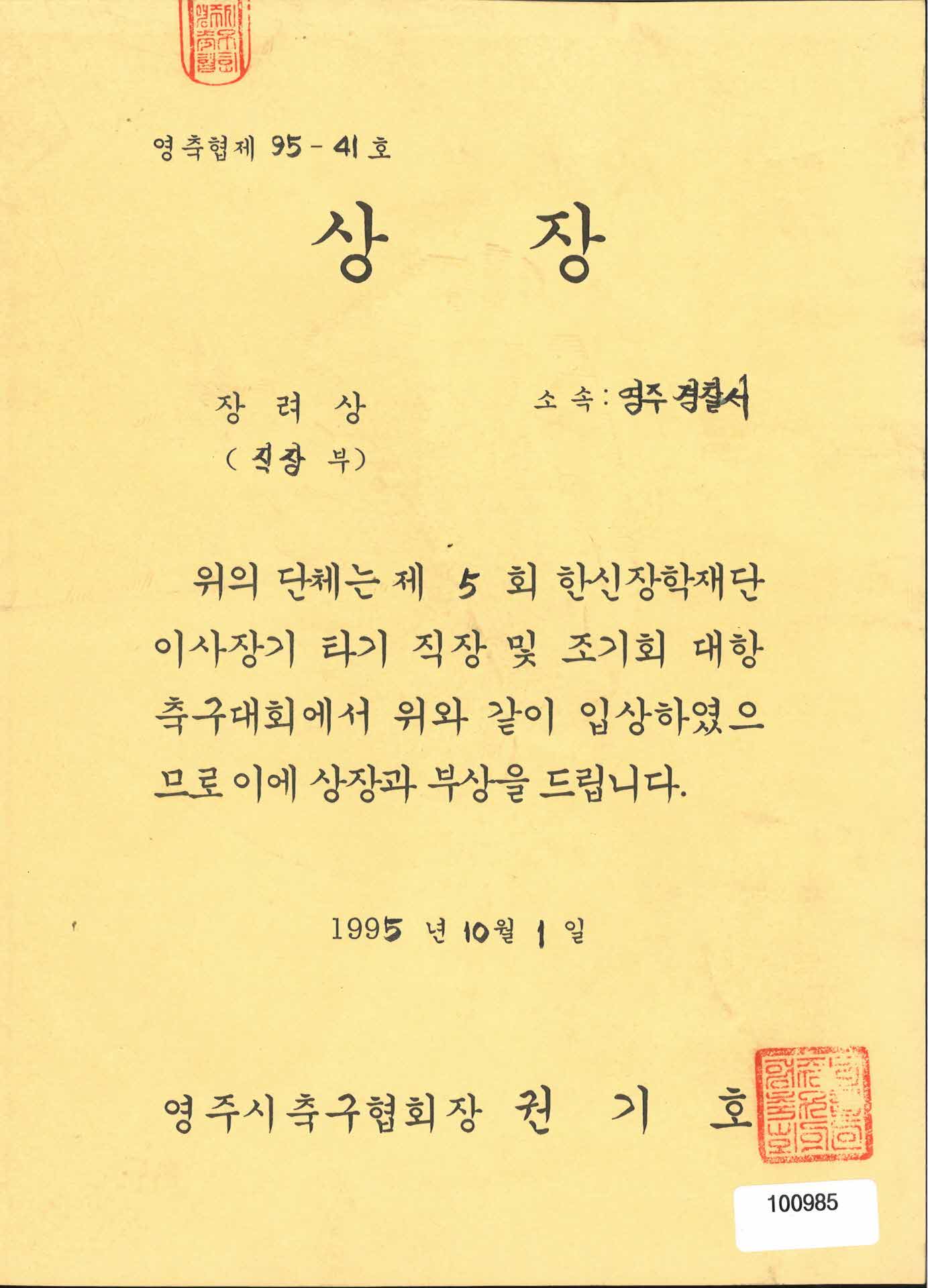 | 기록물명 | 직장 및 조기회 대항 축구대회 상장 | ||