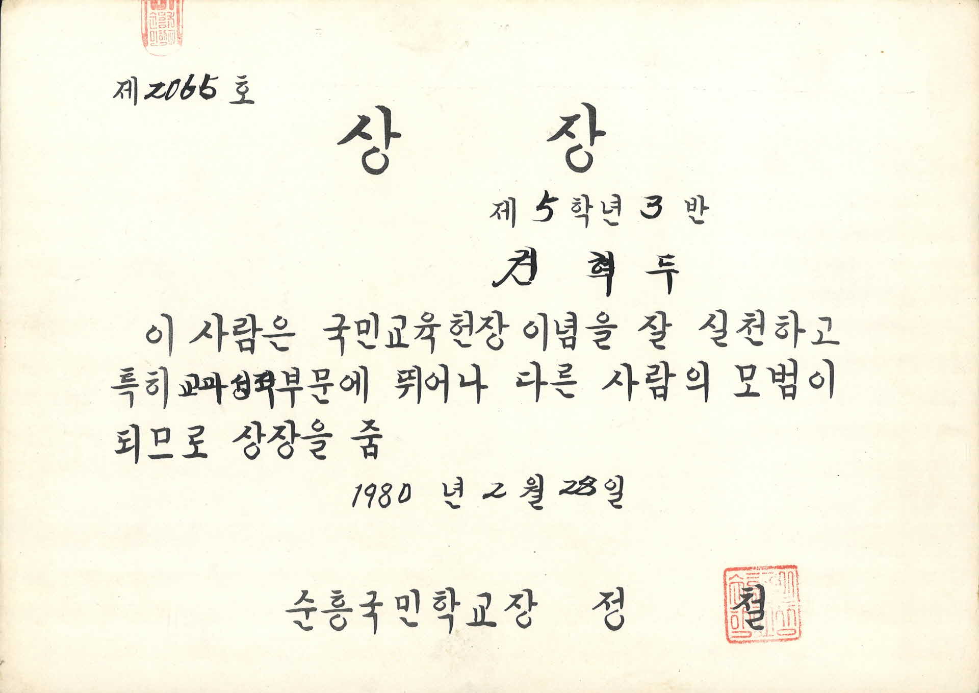순흥국민학교 교과성적 우수 상장