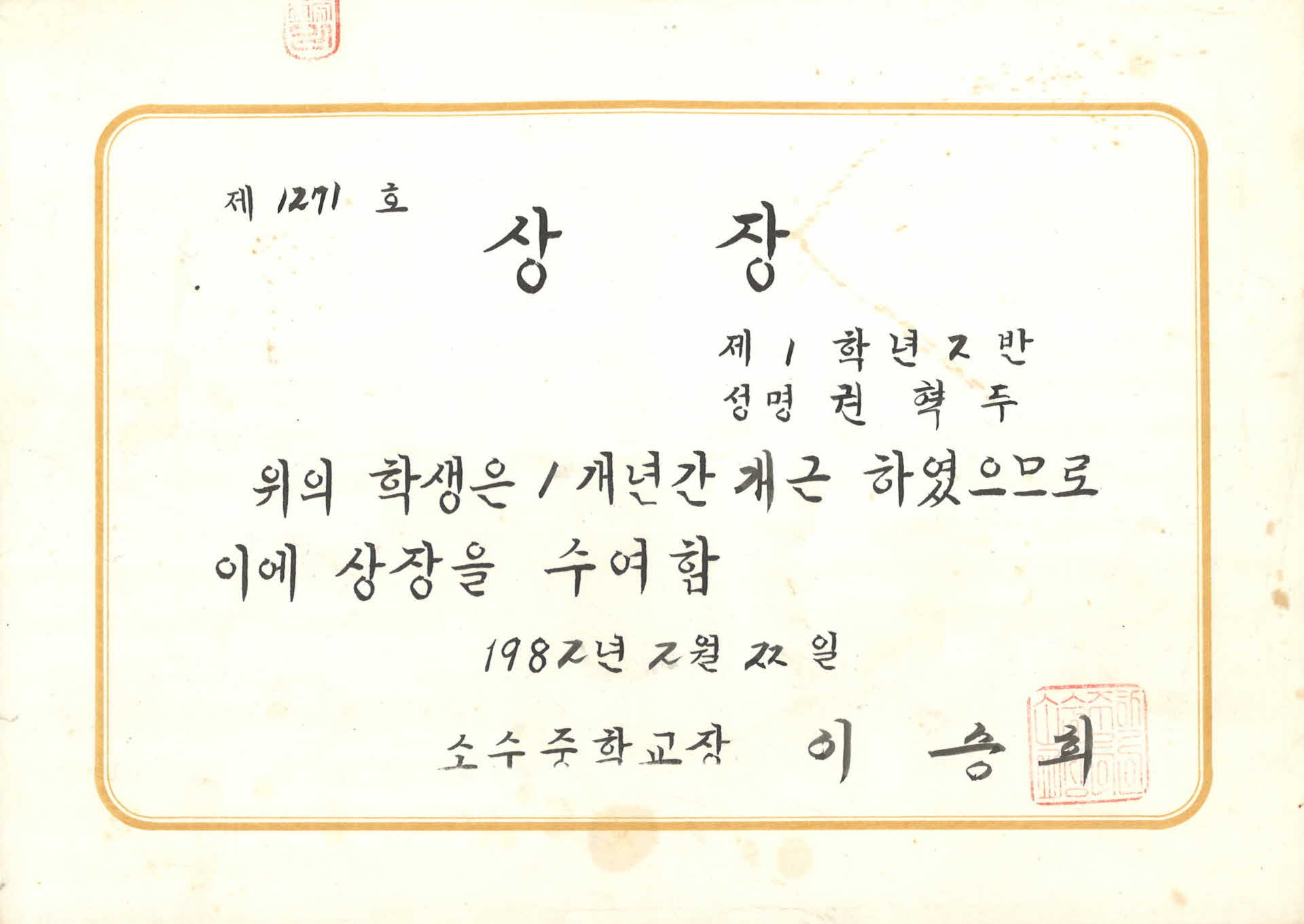 | 기록물명 | 소수중학교 1년 개근 상장 | ||