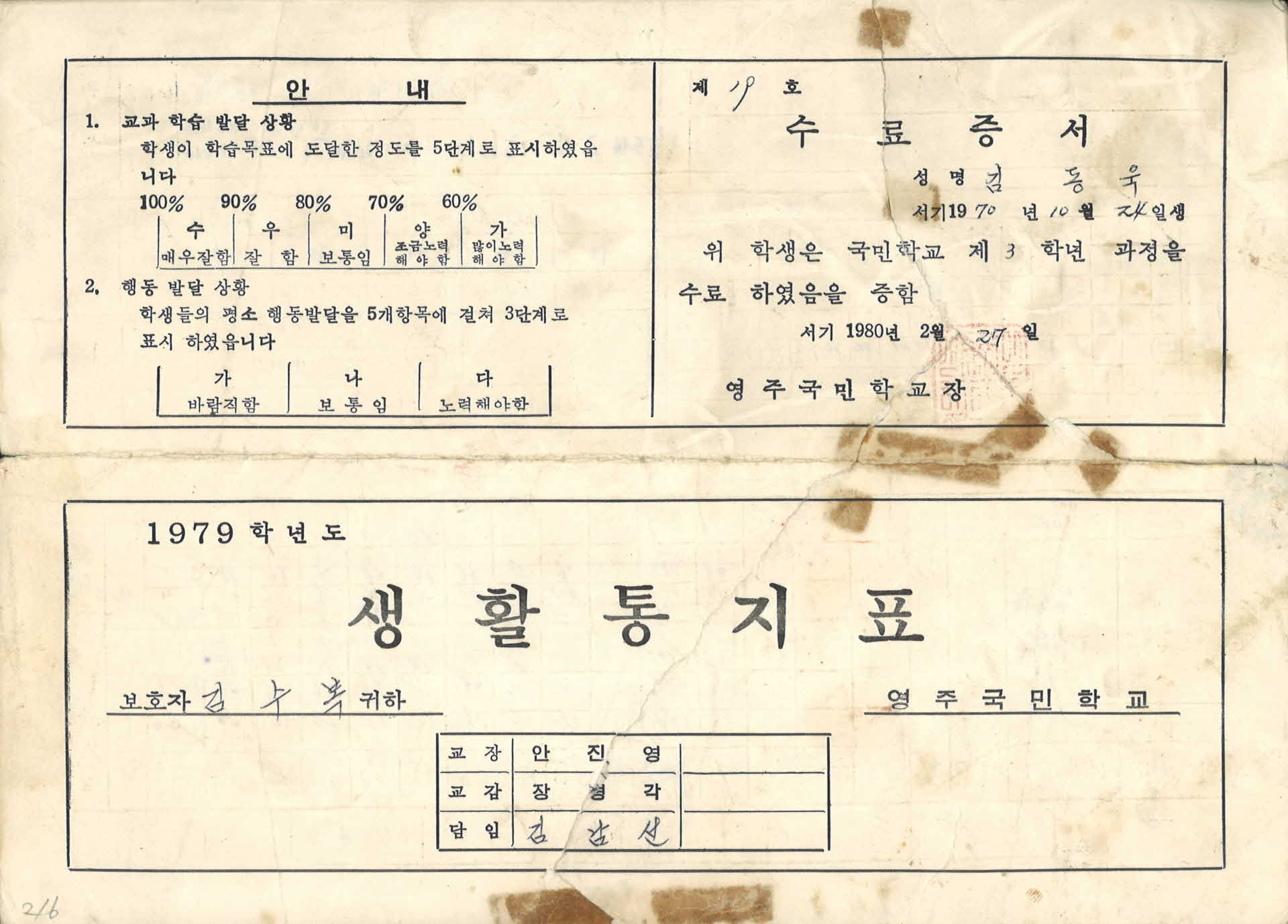 영주국민학교 3학년 생활통지표